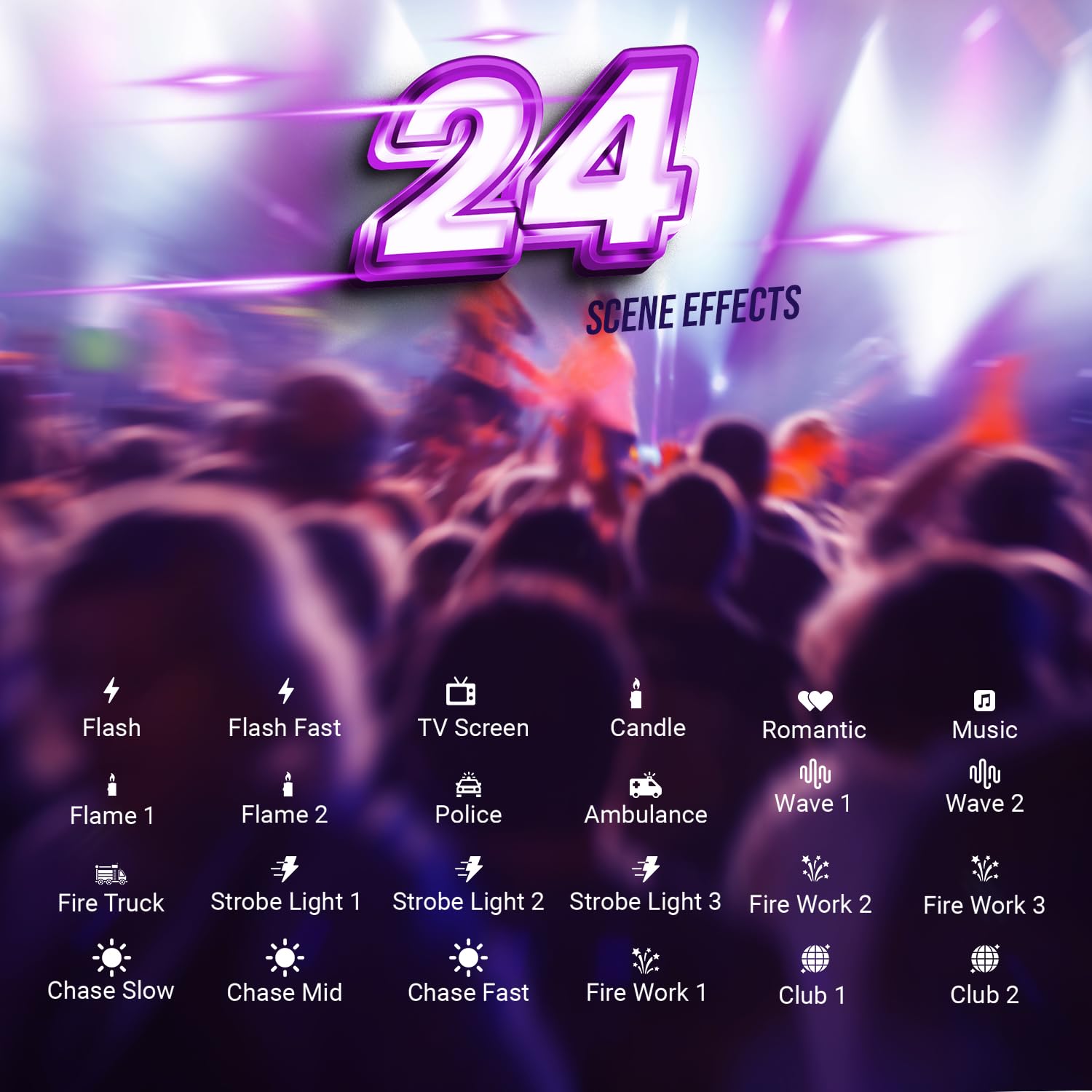 24 Lighting Effects: Features 24 FX modes to simulate various lighting scenarios like lightning, flames, and strobe, enhancing your shoots with cinematic quality and professional-grade visuals.