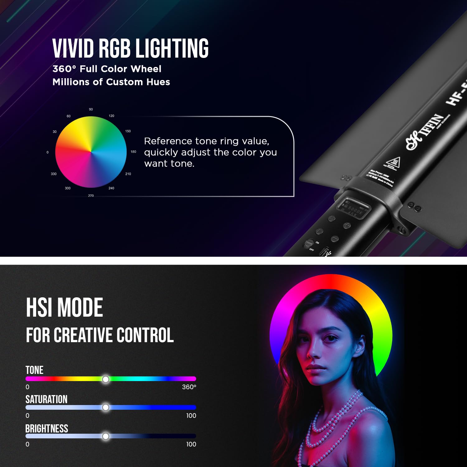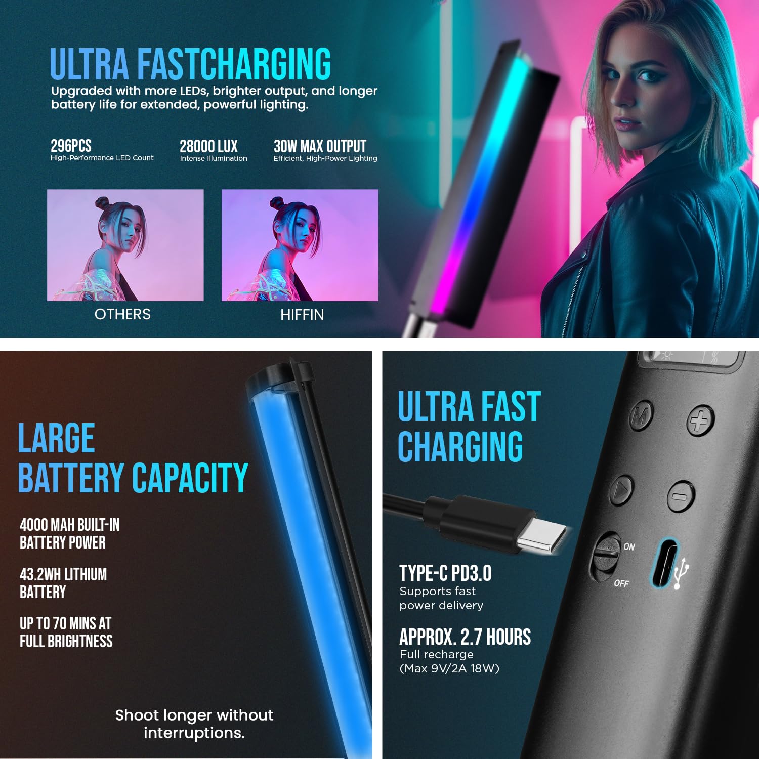 HIFFIN HF-550 RGB LED Stick Light with 30W Power, RGB CCT HSI Mode, 2500K-9900K Adjustable, 24 FX Effect, Detachable Diffuser, App Control, 4000mah Battery Stick Light for Photography & Videography