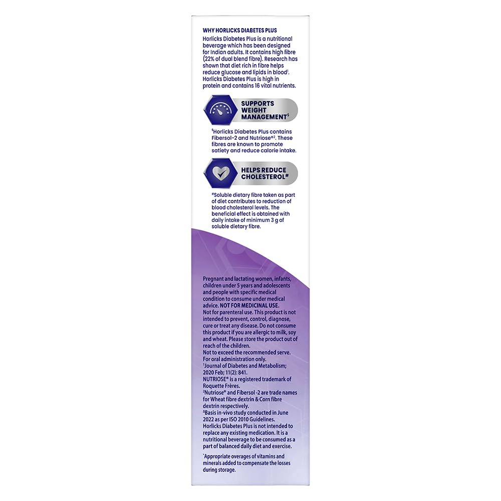 Horlicks Diabetes Plus is a nutritional beverage which has been designed for Indian adults. It is scientifically formulated to support dietary management of at risk and diabetic individuals. It contains high fibre(22% of dual blend fibre Fibersol 2 and Nutriose^ ).Research has shown that diet rich in fibre helps reduce glucose and lipids in blood. Horlicks Diabetes Plus is high in protein and contains 16 vital nutrients. These fibres are known to promote satiety and reduce calorie intake. #Soluble dietary fibre taken as a part of diet contributes to reduction of blood cholesterol levels. The beneficial effect is obtained with daily intake of minimum 3 g of soluble dietary fibre. Horlicks Diabetes Plus is not intended to replace any existing medication. It is a nutritional beverage to be consumed as a part of balanced daily diet and exercise. Journal of Diabetes and Metabolism;2020 Feb;11(2):841. NUTRIOSE is a registered trademark of Roquette Frères ^NUTRIOSE and Fibersol 2 are trade names for Wheat fibre dextrin & Corn fibre dextrin respectively. HORLICKS DIABETES PLUS CONTAINS ARTIFICIAL SWEETNER AND FOR CALORIE CONCIOUS. FOOD FOR SPECIAL DIETARY USE Food for helping manage blood glucose. ‘CONTAINS NATURALLY OCCURING SUGARS’. Contains Dietary Fibre( Dextrin Wheat & Corn ) This contains Acesulfame Potassium. Not recommended for children. No sugar added in the product. CONTAINS ADDED FLAVOUR(NATURE IDENTICAL FLAVOURING SUBSTANCES )