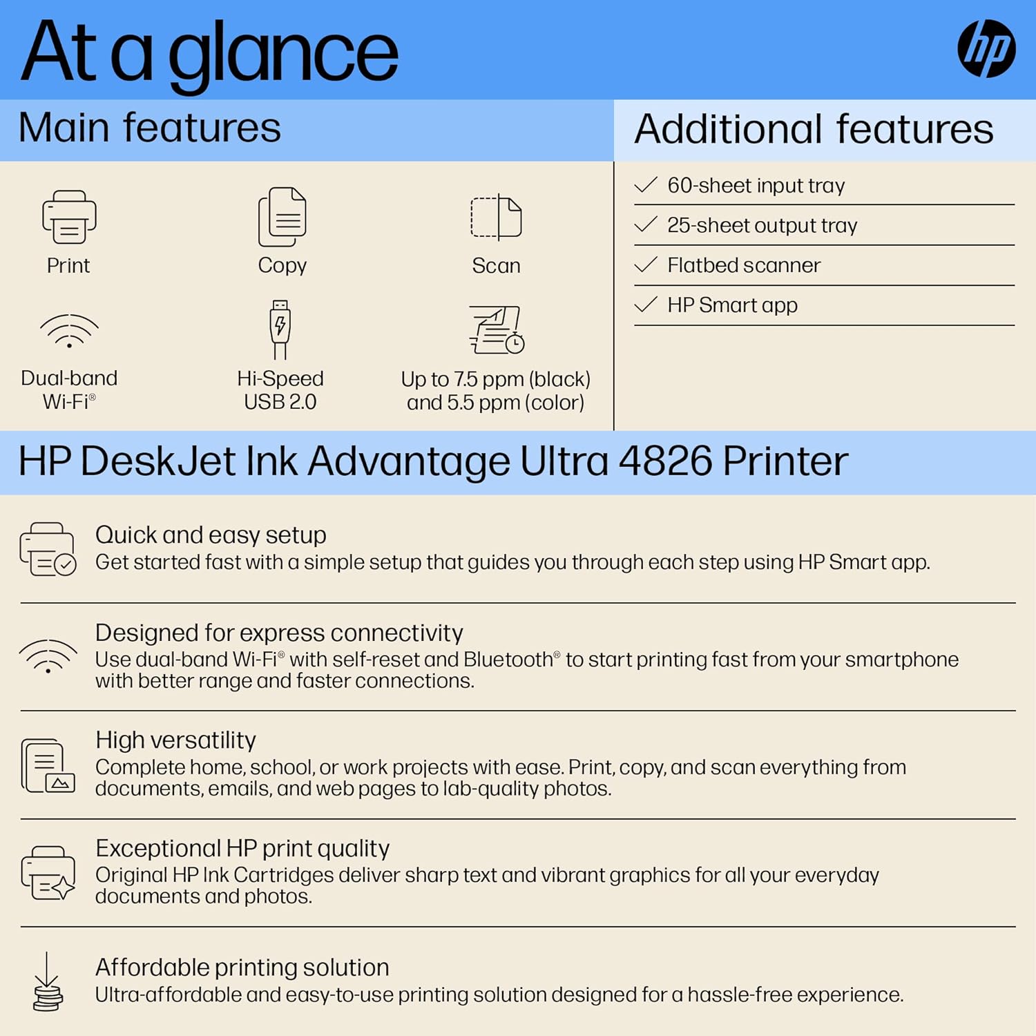 HP Ink Advantage Ultra 4826 Wi-Fi Print, Copy, Scan, Self Reset Dual Band WiFi, 2 Sets of Inbox Cartridges, Smart App Setup. Print Per Page (44P for B/W and 81P for Colour), Ideal for Home, White