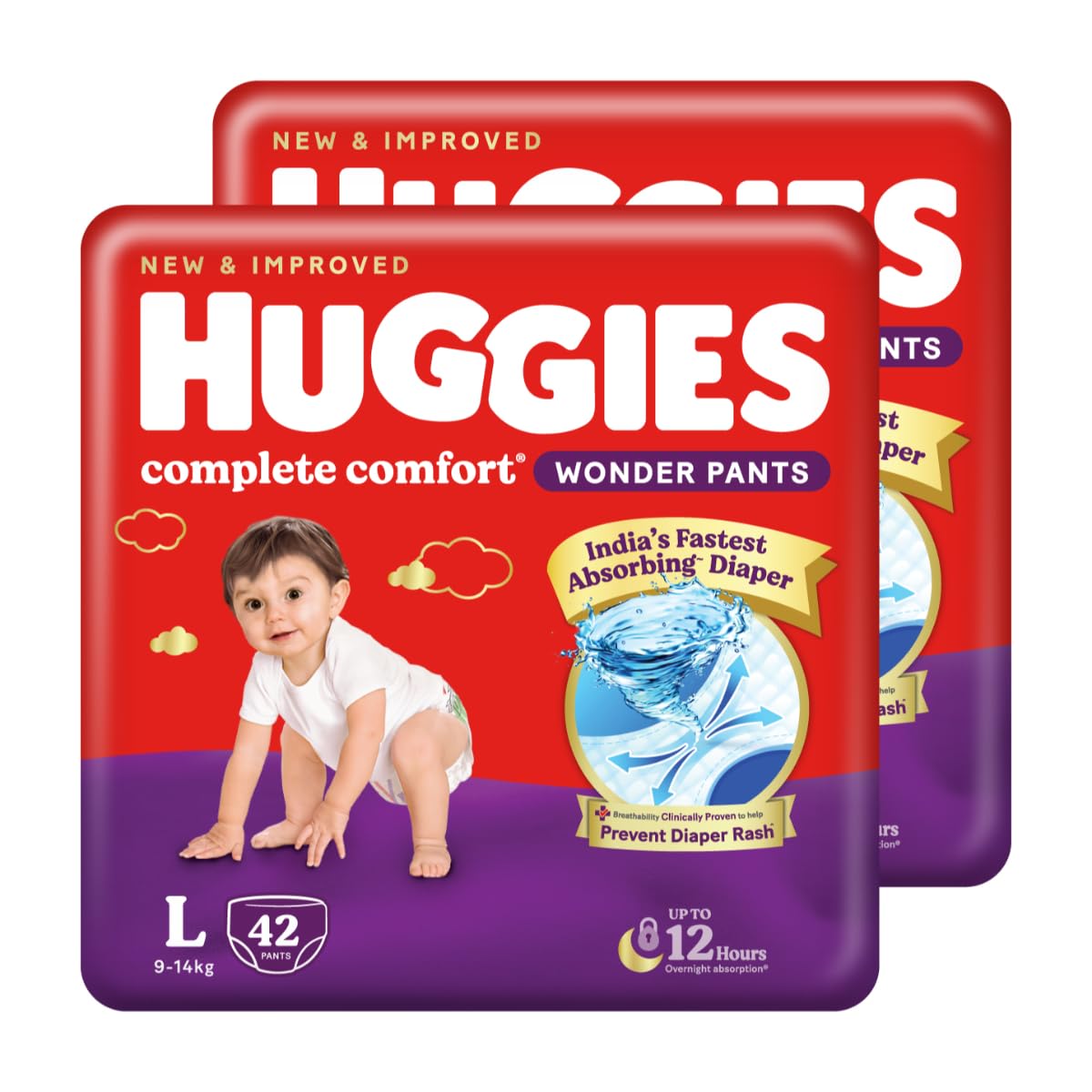 Huggies Complete Comfort Wonder Pants | Pant Style Baby Diapers Large Size, 84 Count | India’s Fastest Absorbing Diaper, Prevents Diaper Rash, Ideal for 9 to 14 Kgs (42 Count, Pack of 2)