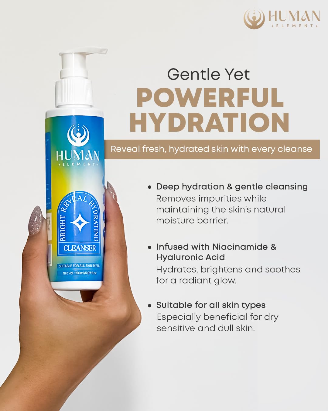HUMAN ELEMENT Bright Reveal Hydrating Cleanser – Deep Cleansing, Hydration & Brightening for Radiant, Healthy Skin | A Gentle, Hydrating, and Glow-Boosting Cleanser with Lactic Acid, Hyaluronic Acid & Rice Extract for Daily Skin Renewal (150ml)