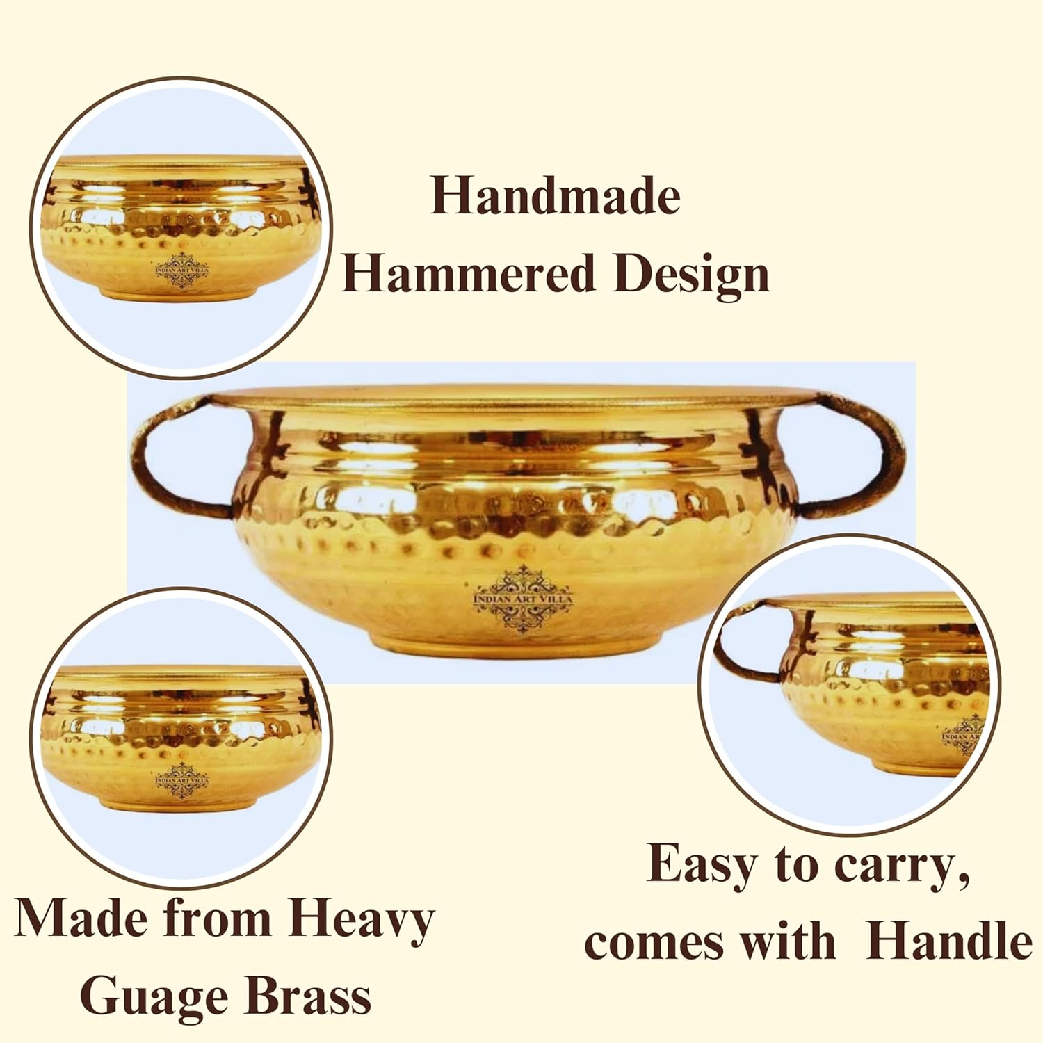 ⚜️ Brass Urli Specification:- Material-Brass, Color-Gold, Weight-515 Grams, Volume-1500 ML, Diameter- 8″ inches, Height-3.4″ inches