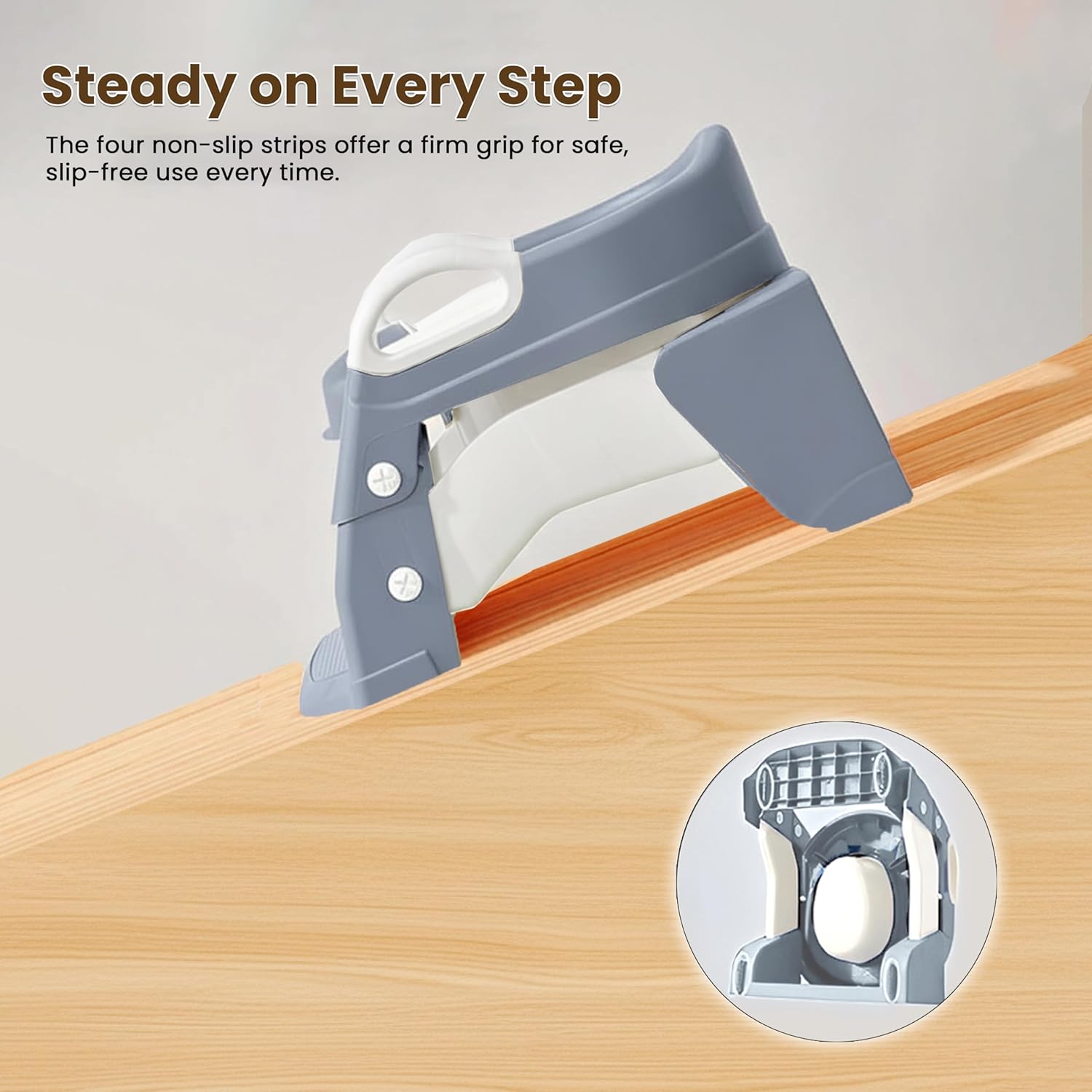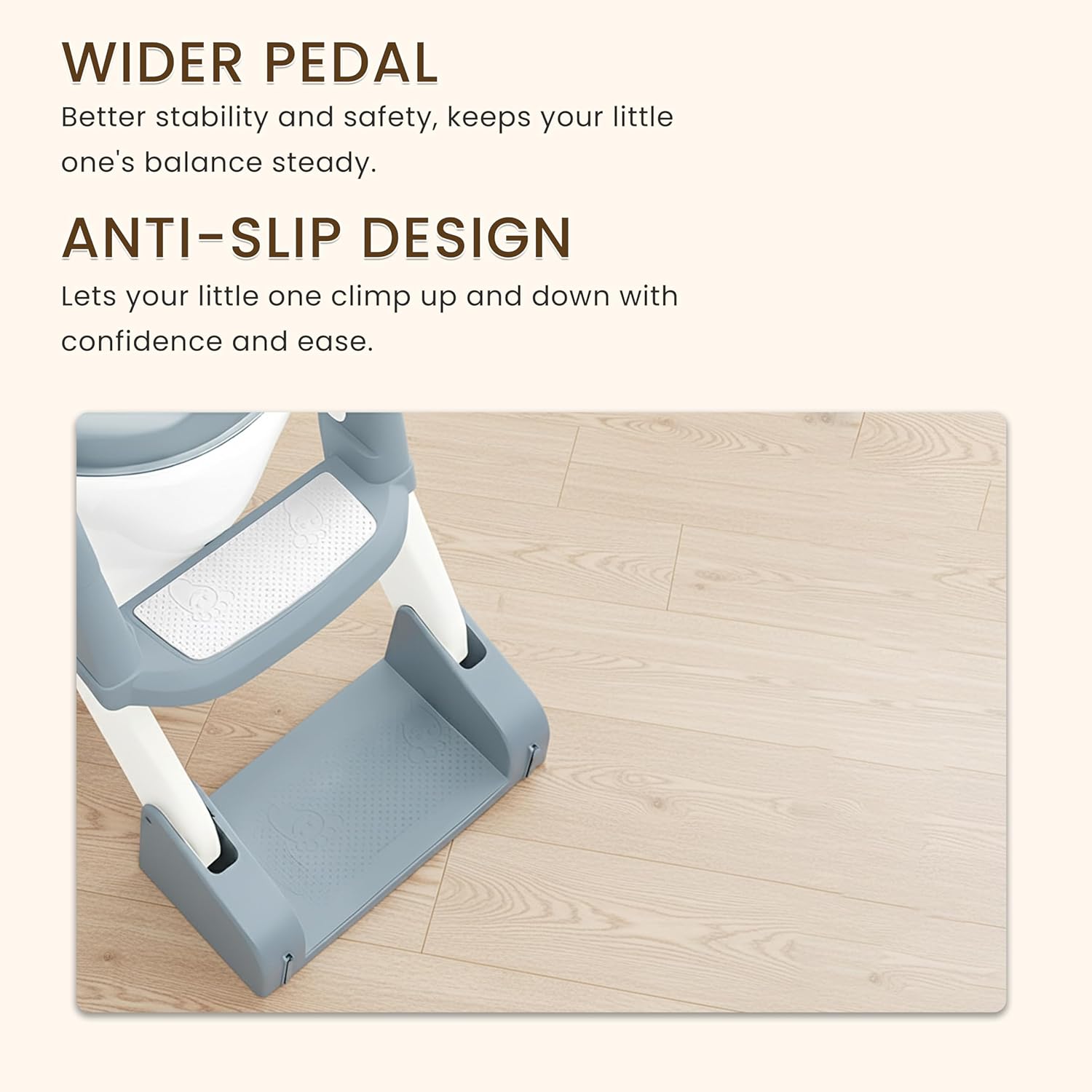 👣 The wider pedal and anti-slip design ensure complete stability and balance, letting your toddler climb safely. 💪 With 4 non-slip stoppers and rounded side handrails, every step is secure and steady.