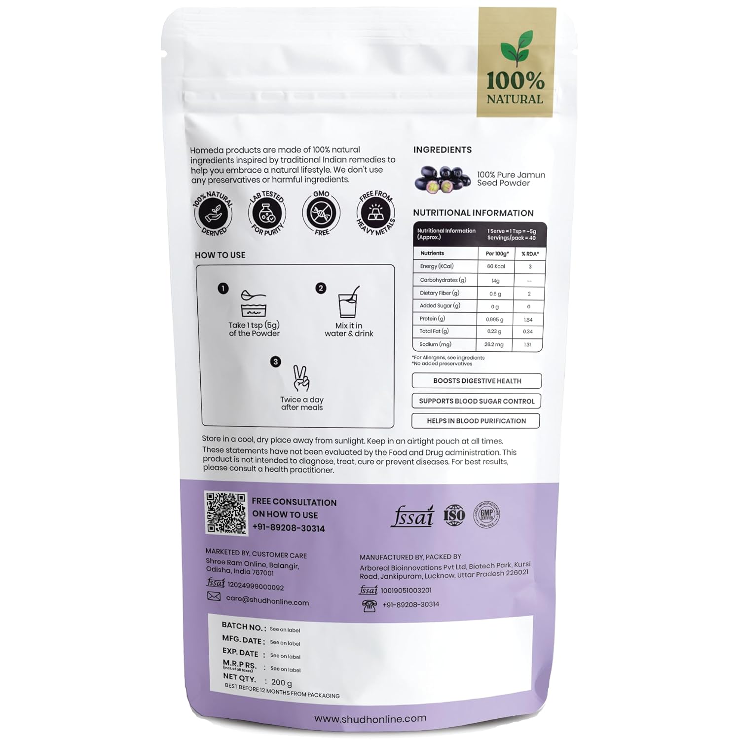 HOMEDA ORGANIC JAMUN SEED POWDER: YOUR DAILY DIABETES & WELLNESS SUPPORT. Sourced from the finest Organic Black Jamun ki Guthli (Kala Java Plum Seeds), our powder is specifically crafted to act as a natural Diabetes Control Powder. HOW TO CONSUME: The ideal Jamun Powder dosage for diabetes is generally 1/2 to 1 teaspoon daily, mixed with water or your favorite juice, preferably on an empty stomach. WHY SEEDS? The seeds are known to be far superior to the fruit pulp, concentrating the benefits. They are rich in flavonoids and other powerful antioxidants, which may assist your body’s detoxification process. STORAGE TIPS: To preserve the purity and potency, store your Neredu Naval Kottai Powder in an airtight container in a cool, dry place. It should not be refrigerated, as moisture can cause clumping and spoilage. Verify Purity by checking the organic certification on our packaging.