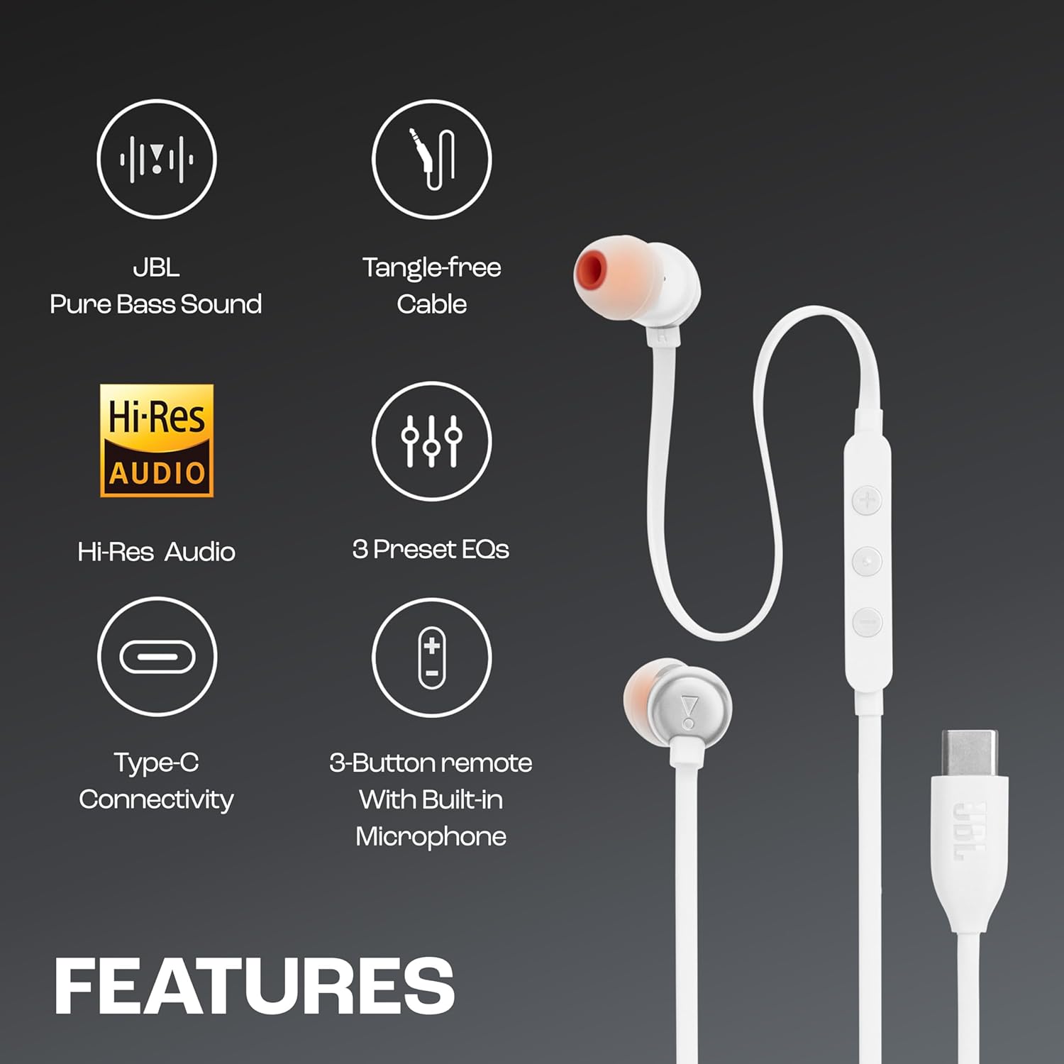 JBL Tune 310 Wired in Ear Type C Headphones, Hi-Res Audio with Digital-to-Analog Converter, 3-Button EQ Preset Remote with Microphone, Tangle-Free Flat Cable, Compatible with USB-C Devices (White)