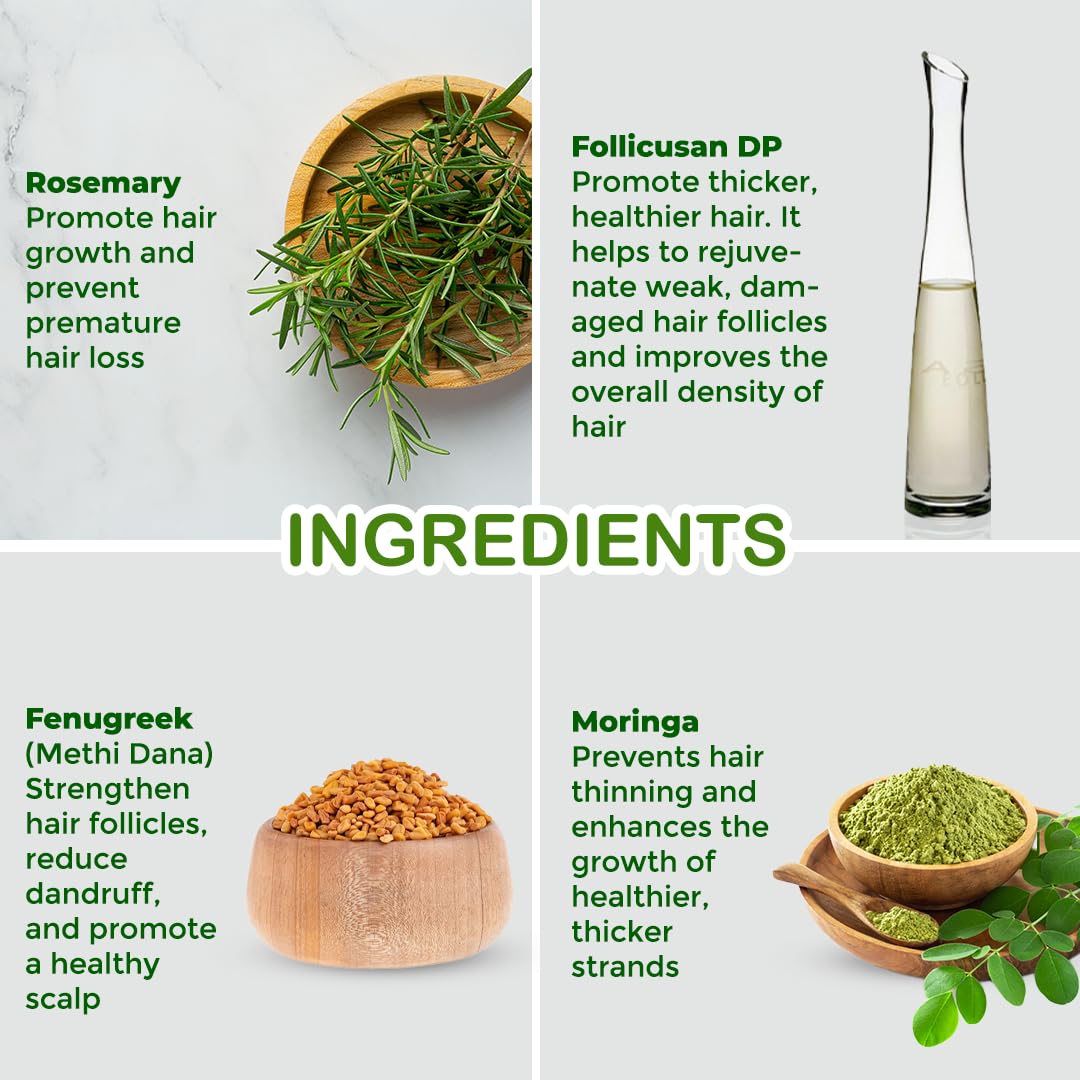 PREVENTS HAIR FALL & THINNING – Fortified with Fenugreek & Moringa, this powerful blend reduces hair loss, strengthens the roots, and improves hair density by providing essential vitamins and nutrients to the follicles.