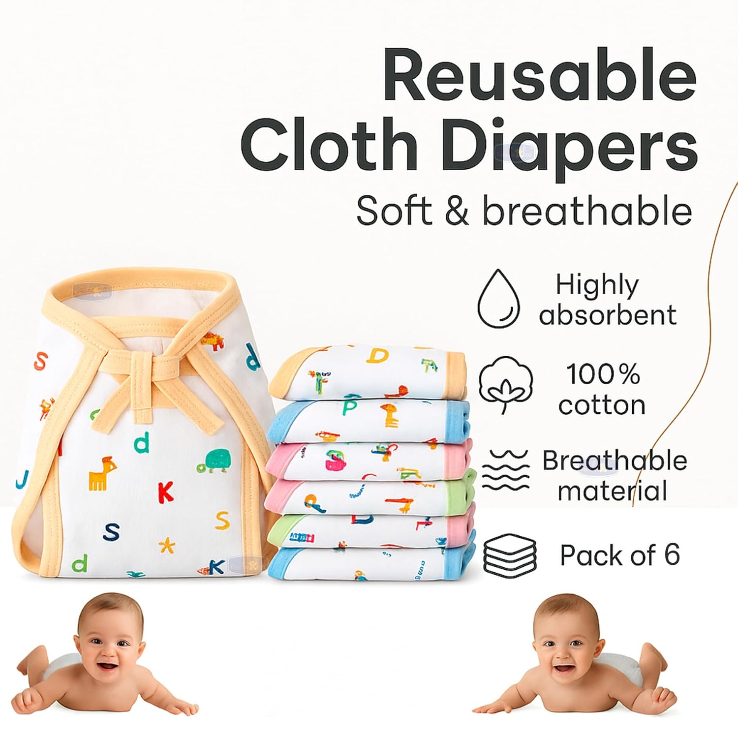 Koochie-Koo Cotton Diapers S Size Langots For New Born 3-6 months for Baby (Pack of 6) Reusable Cloth Nappies for Newborn Baby Soft & Breathable Washable Diaper Pants For Boys & Girls Large Small