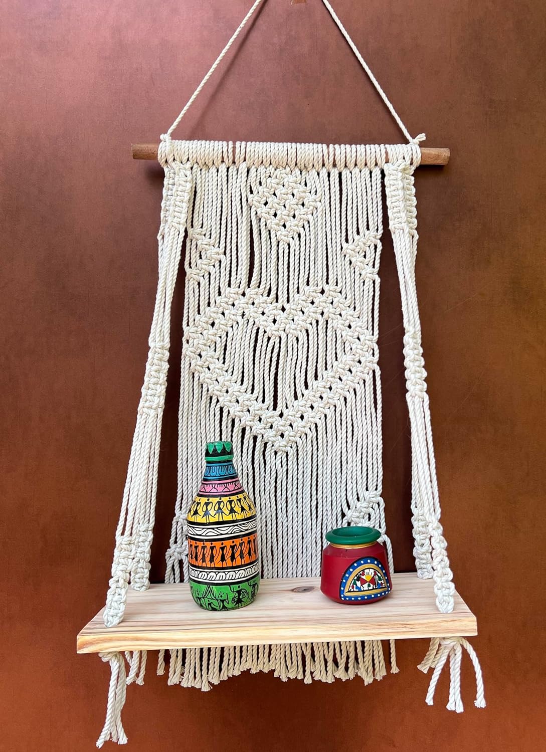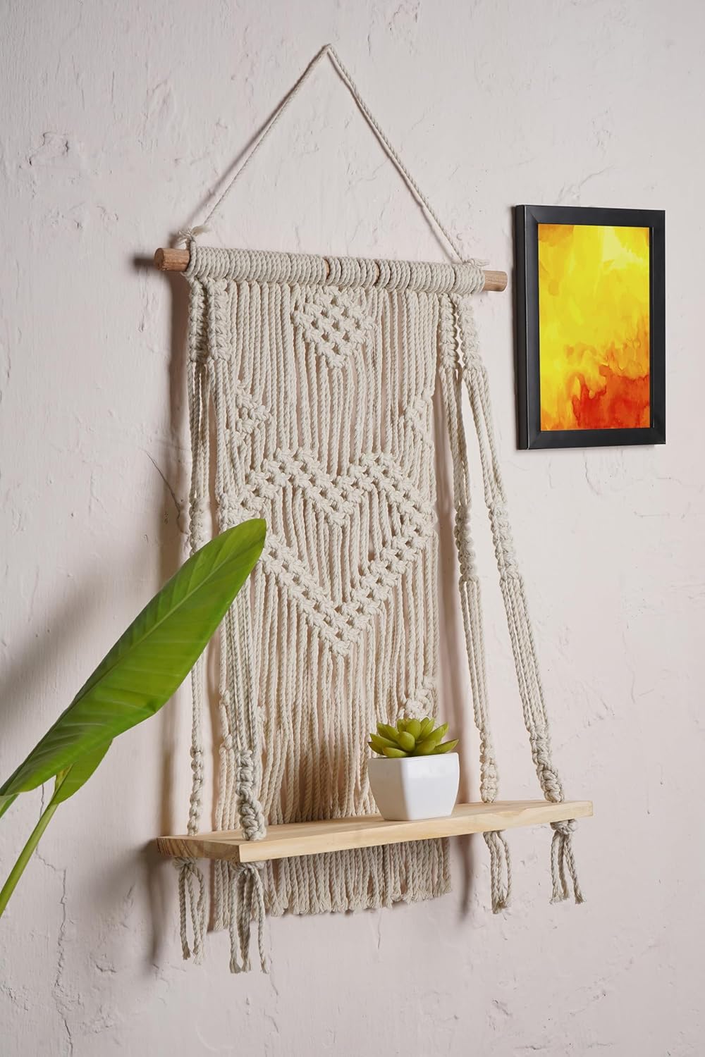 Each piece is exquisitely handmade with 100% natural cotton rope and attention to detail. Sanded smooth wooden shelves with a captivating natural finish all combine to create a conversation-stirring macrame hanging shelf