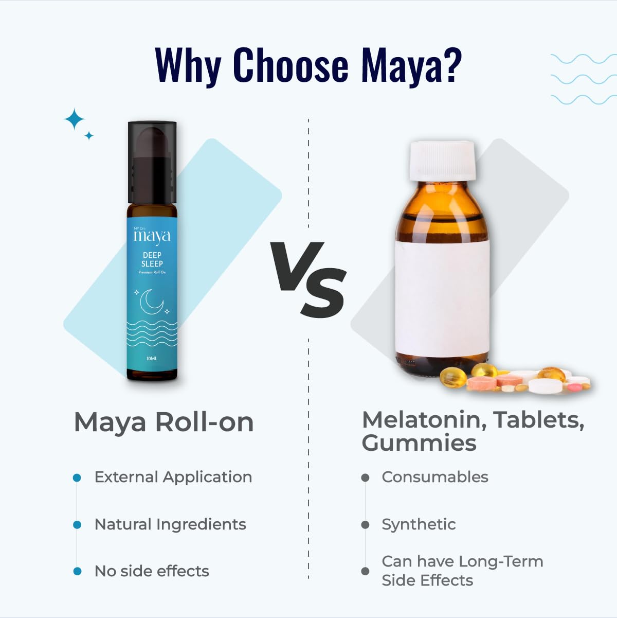 Maya Deep Sleep Roll On is a 100% natural, Ayurvedic sleep aid crafted with a soothing blend of essential oils like Lavender, Chamomile, and Vetiver. Designed to promote deep, uninterrupted sleep, it helps calm the mind, ease restlessness, reduce mild snoring, and regulate sleep cycles. Whether you struggle with insomnia, anxiety, or simply want to enhance your bedtime routine, this non-sticky, quick-absorbing roll-on is a safe and effective choice. Travel-friendly, gentle on skin, and suitable for daily use, it’s your natural solution for peaceful nights and refreshed mornings.