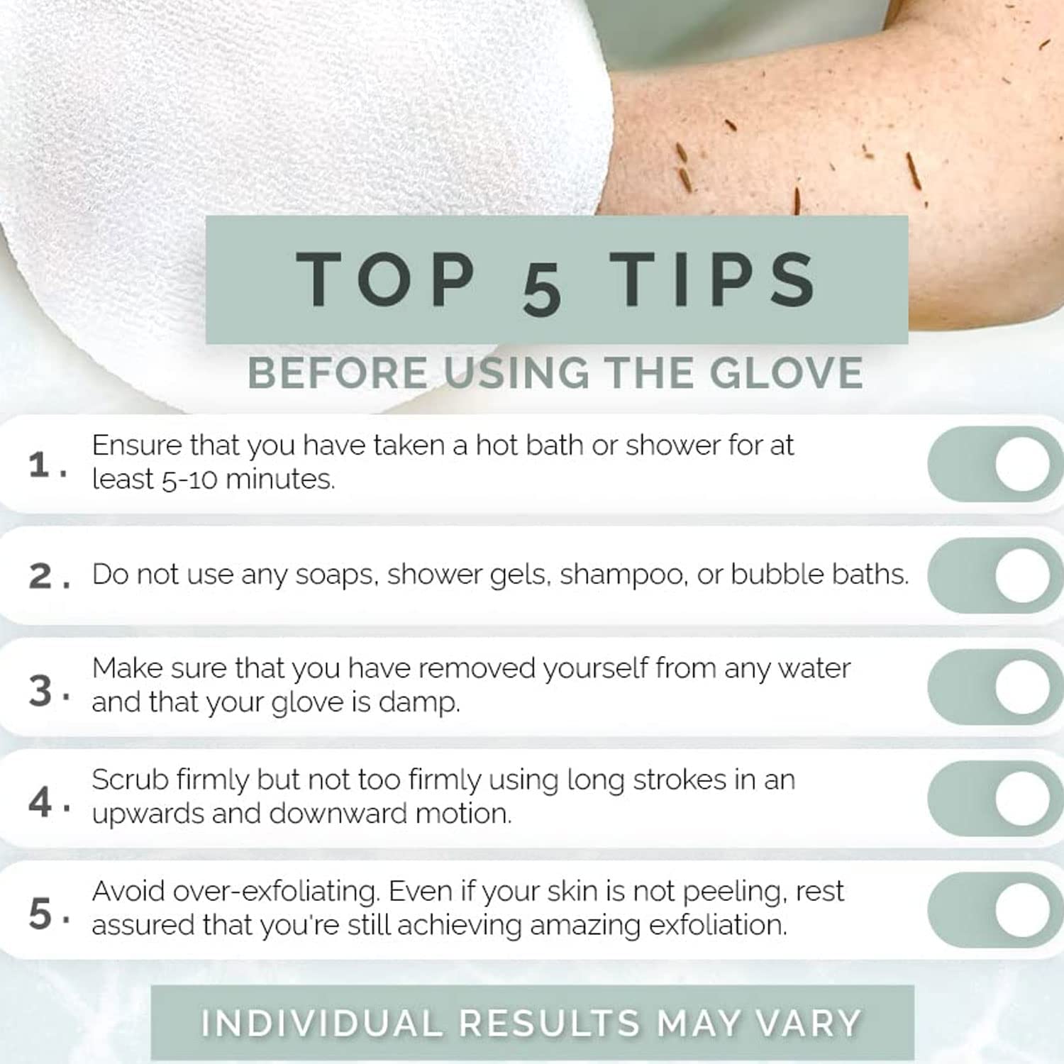 Scrub all over. Be careful around your face and delicate areas. Rub in a back-forth motion. Rubbing too hard and circular tends to put too much stress on your skin and may irritate. While a bit uncomfortable in the beginning you will see the skin start to peel away. Your skin needs to regenerate and this process helps develop healthy skin. Don’t rub to excess. You should not use the Kessa Glove if you are currently experiencing any of the following: Generally have thin, delicate, or sensitive skin; currently have sun-damage skin; currently experiencing an allergic skin reaction or outbreak; currently experiencing skin inflammation or swelling; currently have wounded or a scratched skin * Important Notes: The Kessa glove should not be used on delicate skin areas, such as around the eyes. Glove shrinks by 20% after washing.