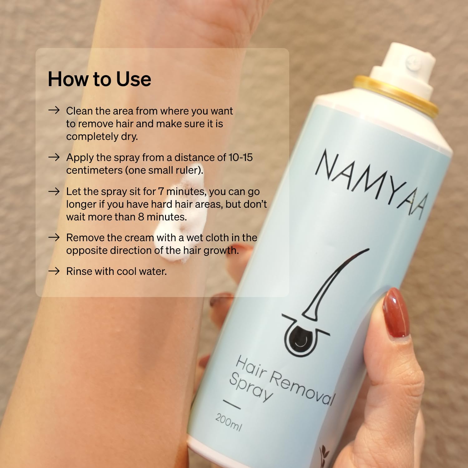 PAINLESS HAIR REMOVAL : Namyaa Hair removal can be painless too! You do not have to undergo the pain of waxing every time you wish to have a clean body. Now, you can just spray away unwanted body hair and have clean skin in minutes with this Namyaa hair remover spray for women.
