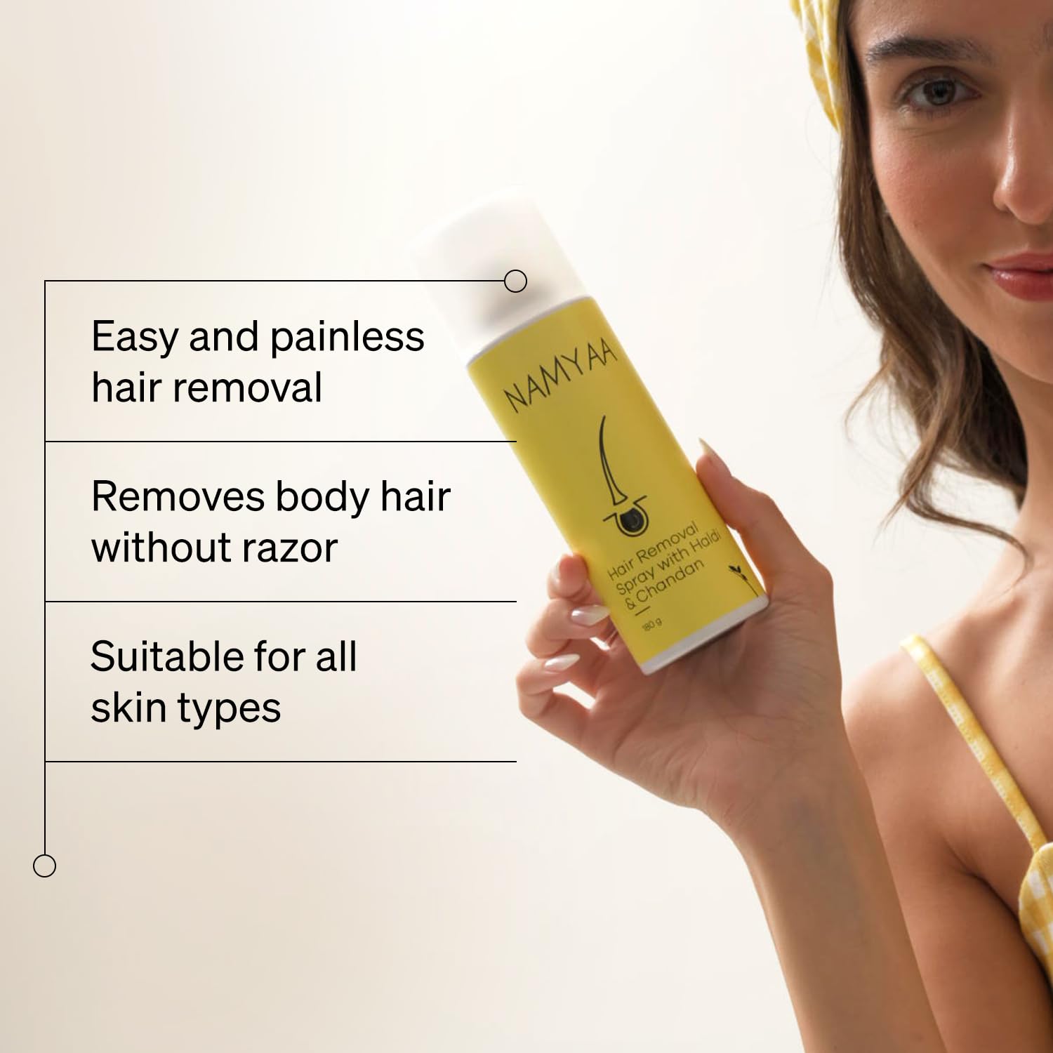 Generic Name : Namyaa Haldi Chandan Hair Removal Cream Spray | Painless Body Hair Removal Spray (180 ml)