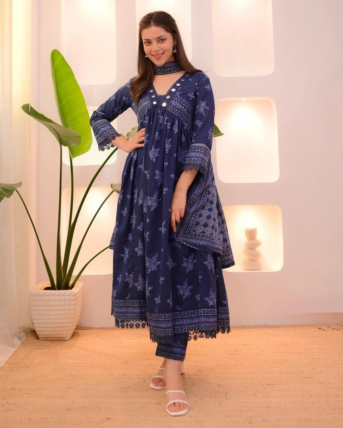 Nermosa Women Printed Anarkali Kurta and Pant Set with Dupatta