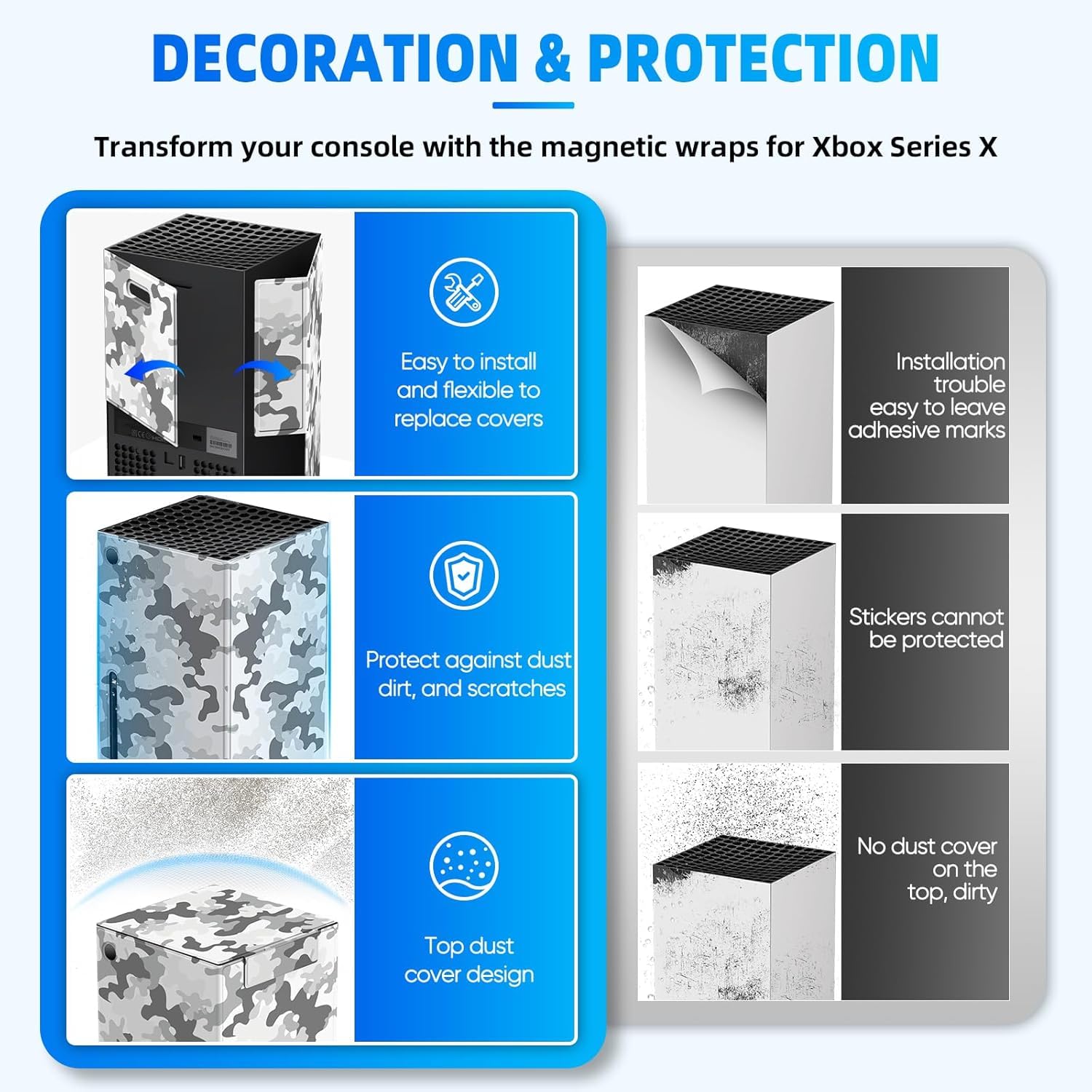 【Magnetic Attachment for Easy Installation】Our cover wraps for Xbox Series X console feature a convenient magnetic closure design, making it incredibly easy to install. Simply align the wrap and top cover with your console and let the magnets do the rest. No any messy adhesive, tools or complicated steps required.