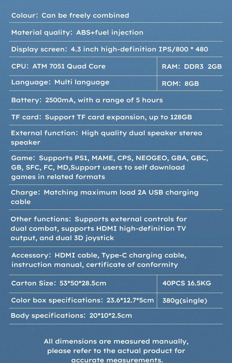 Package contain– 1 pc hand game , 1 usb cable , 1 HDMI and user manual