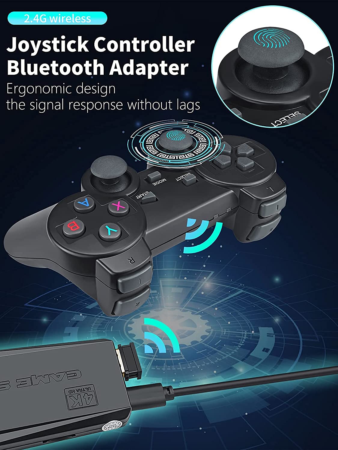 【 Retro Games】This wireless TV game console rich games, is pre-install 9 emulators, and pack with 64GB TF card. No need to download and install by yourself, no internet required, you can play classic games just by connecting to the TV. Let you play games every day and bring back your memory to the fun of childhood,enjoy family entertainment time.