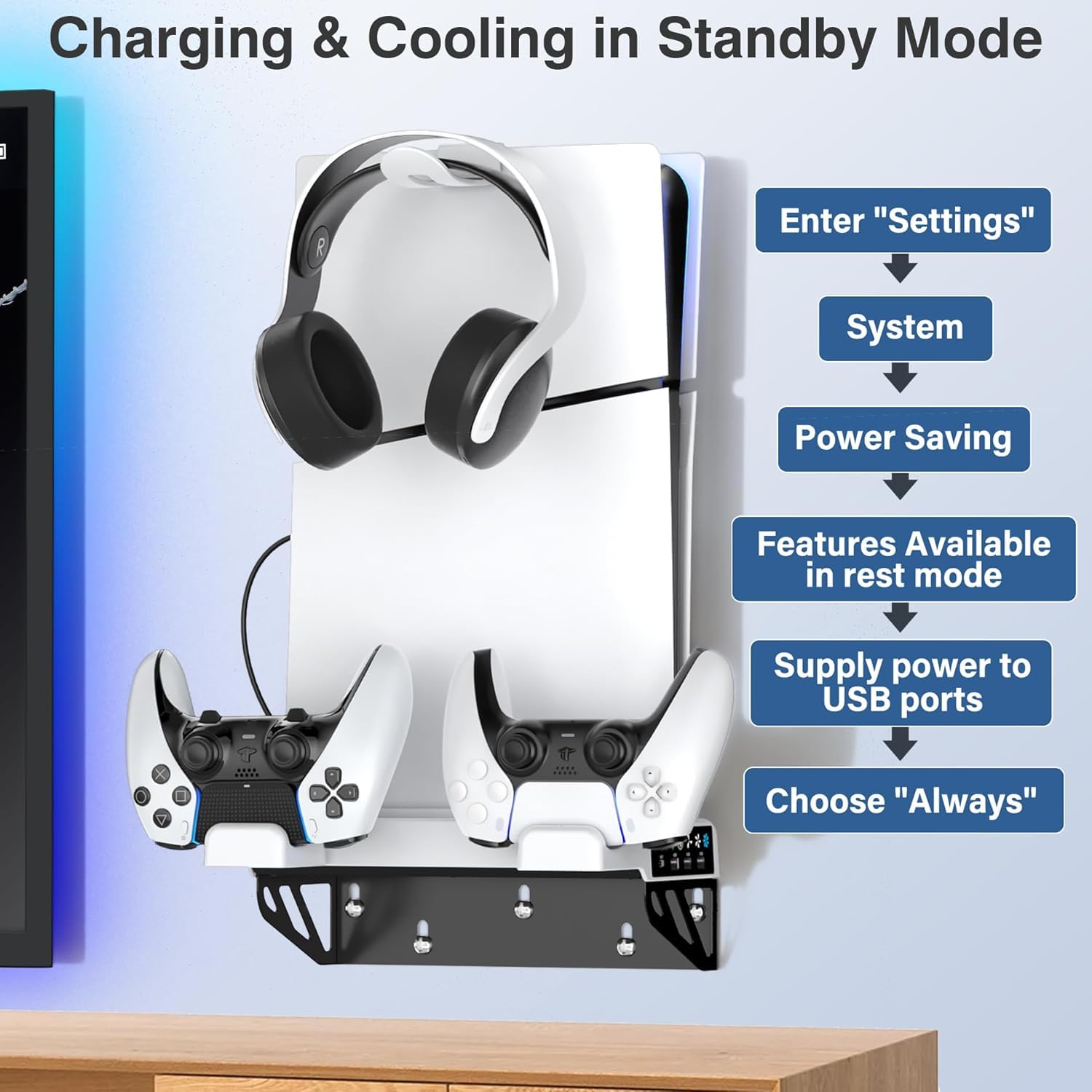 【3 Gear to Adjust Fan Speed】Two silent cooling fans in the PS-5 vented base keeps PS-5 console cooler. With touch switch and adjustable fan speed, repectively high, medium, low and close, PS-5 cooling station provieds better heat dissipation which can prolong the life of PS-5 console. Keep charging & cooling in standby mode (Enter “setting”-system-power saving-features available in rest mode-supply power to USB ports-choose “Alway” ).