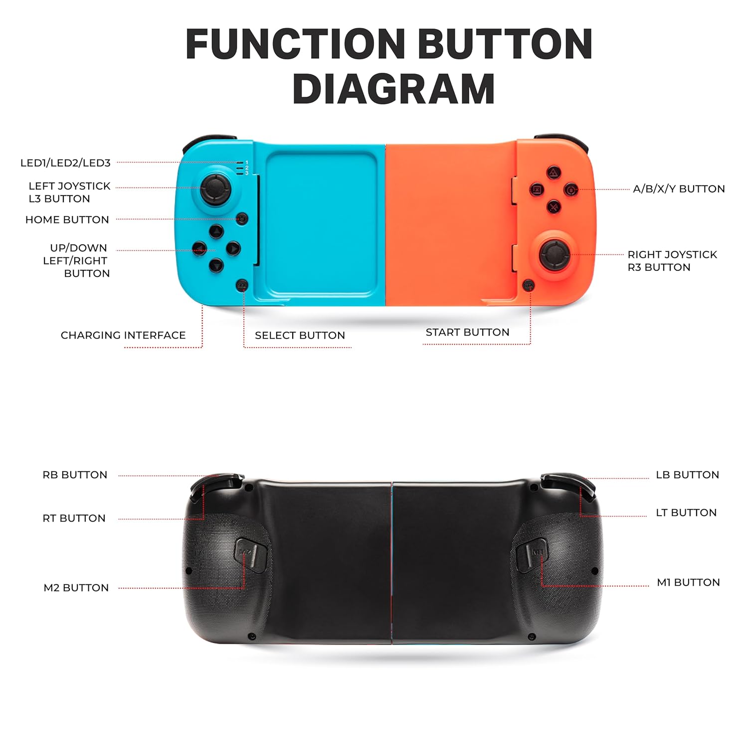Transform your gaming experience with the NITHO V50 Extensible Wireless Controller, a versatile gaming companion compatible with multiple platforms including Switch, PS4, PS3, PC, Android, and iOS. The innovative telescopic design extends from 135mm to 173mm, perfectly accommodating various smartphone sizes for comfortable mobile gaming. Featuring precise dual analog sticks, responsive digital triggers, and customisable M1/M2 programmable rear buttons, this controller delivers professional-grade control across all gaming genres. The sleek design incorporates RGB backlighting for main buttons with an on/off switch, while the built-in 350 mAh Li-ion battery provides up to 12 hours of gaming on a single charge. Connect wirelessly via Bluetooth 5.0 or use the included USB-C cable for corded play. The controller supports motion controls for compatible games and includes turbo functionality. Whether you’re gaming on your mobile device or console, this controller adapts to your needs with its multi-platform compatibility and ergonomic design. The striking red and blue colour scheme adds a touch of style to your gaming setup.