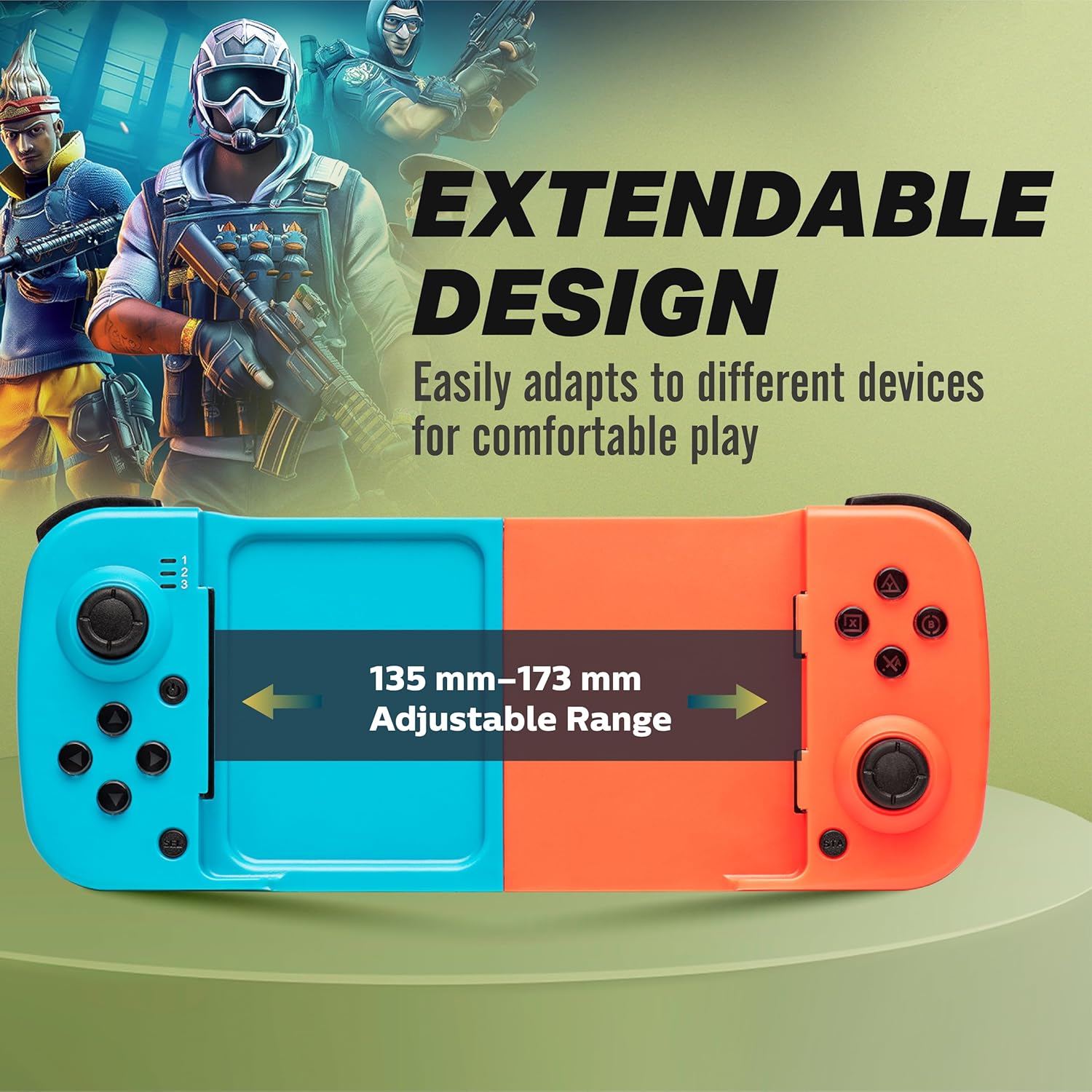 EXTENDABLE DESIGN: Telescopic grip extends from 135 mm to 173 mm to fit a wide range of smartphones and handheld devices securely, ensuring a stable and comfortable mobile gaming experience