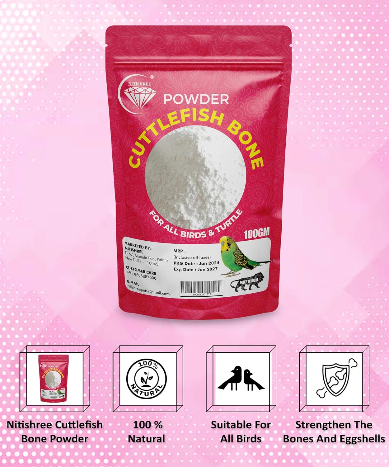 Nitishree Cuttlefish bone powder is a premium natural nutrition for all type small to large birds , hand picked. This dramatically strengthens the birds immune system and works as a probiotic.