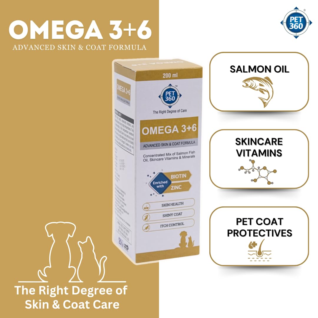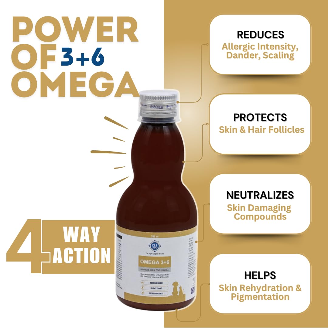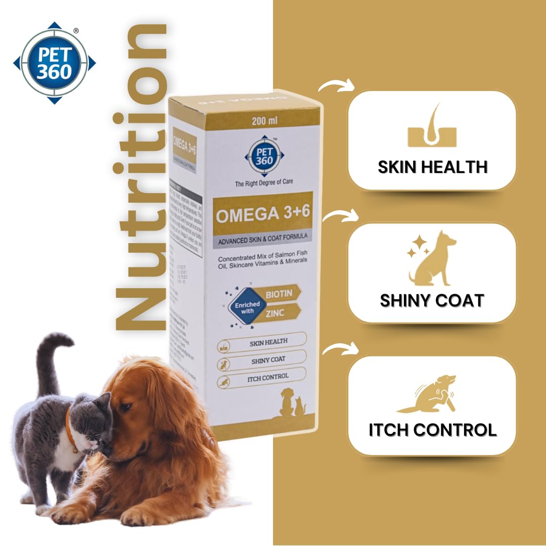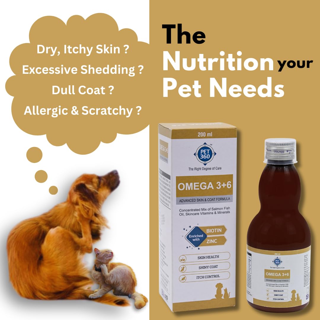 RELIEVES ALLERGIES & ITCHING: PET360 OMEGA 3+6 plays a key role in decreasing allergic intensity & reduces chances of dander and skin scaling. It also helps reduce skin rashes, itching & controls allergies. This fish oil supplement promotes a healthier skin barrier, making it a must-have in pets skin and coat supplements.