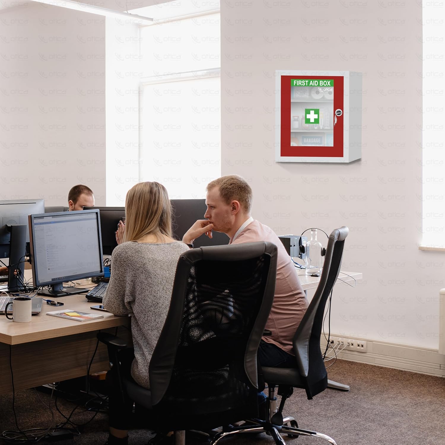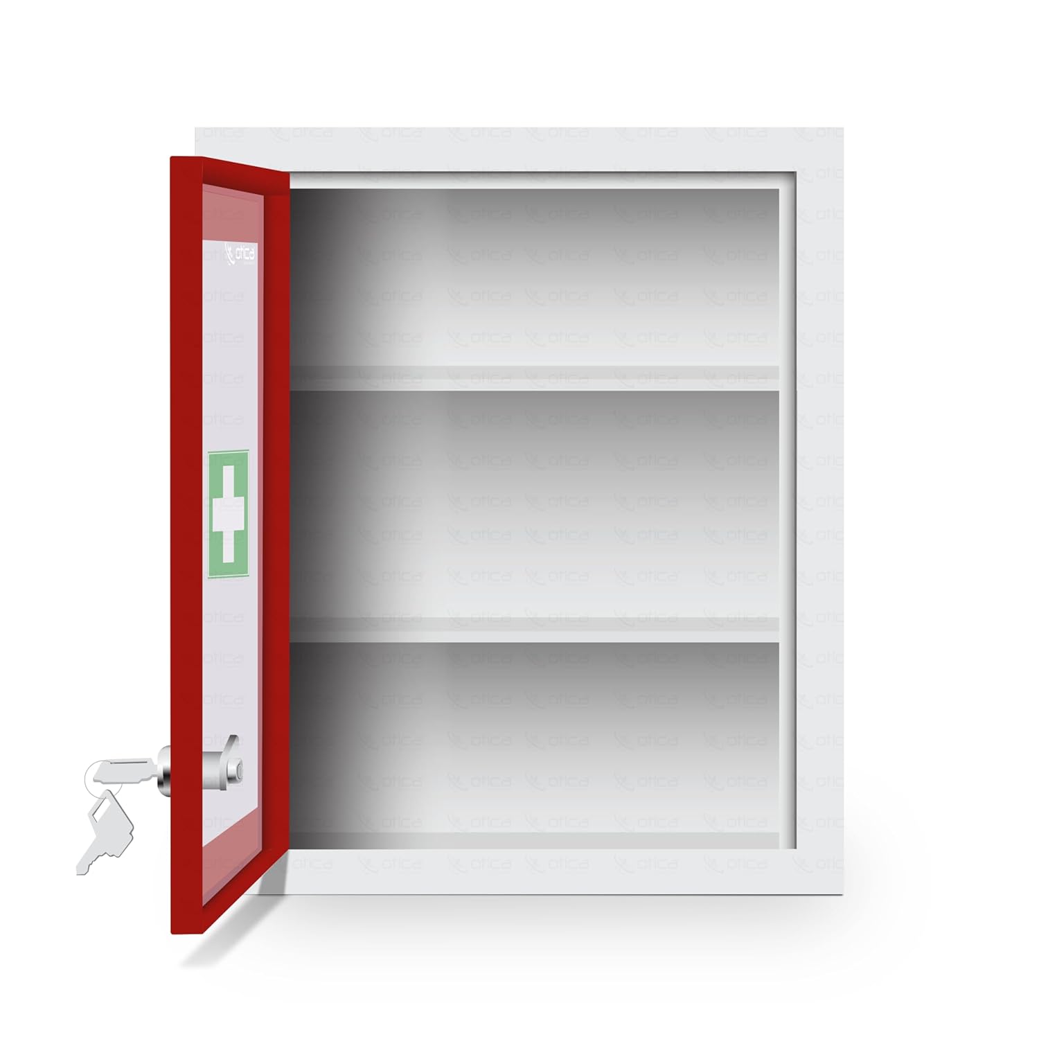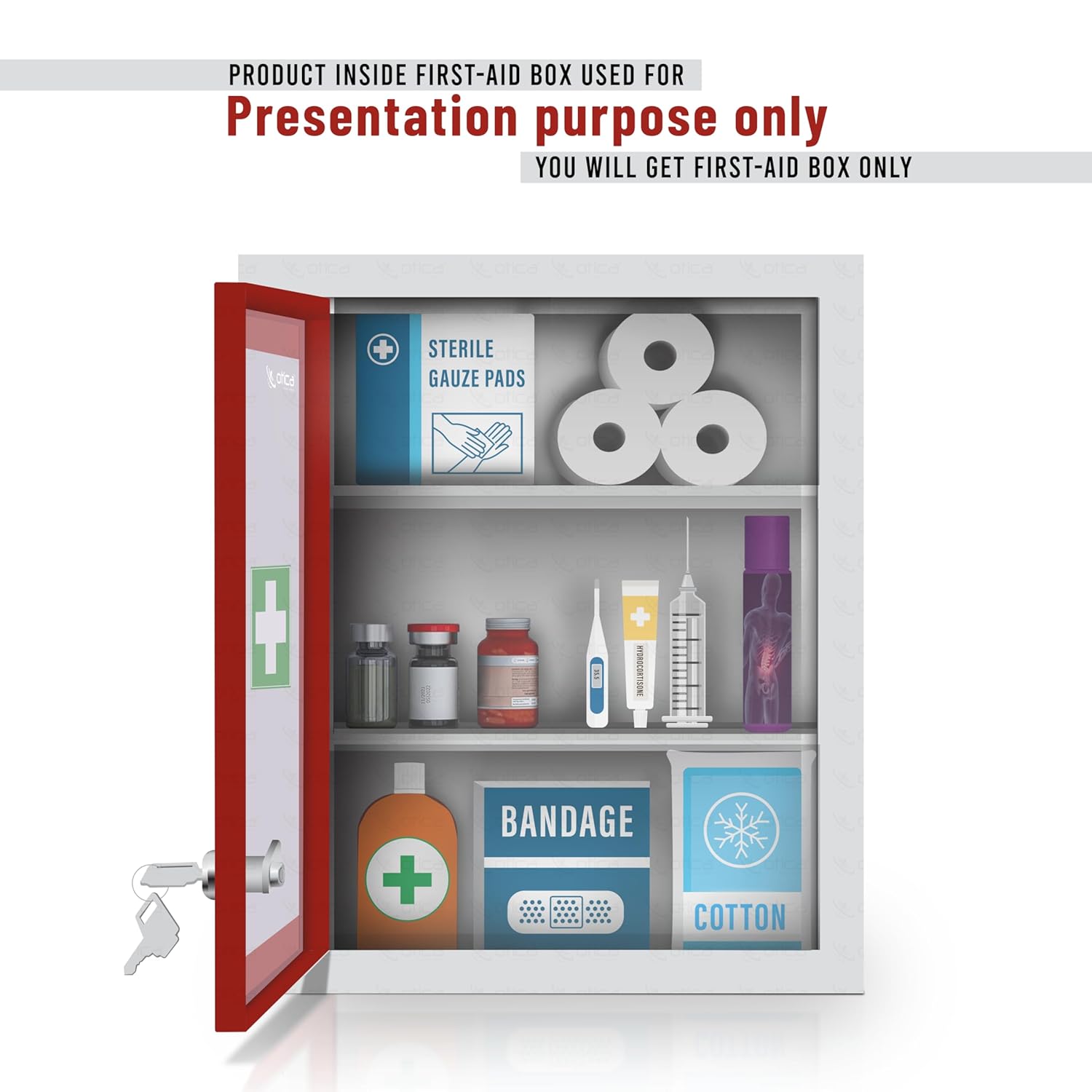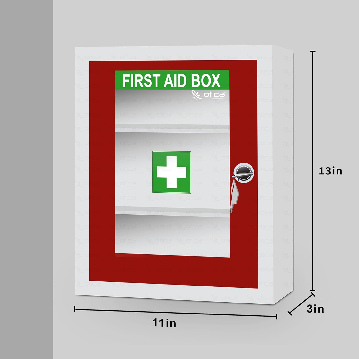 OTICA first aid kit box made from GI metal with red & ivory 7-layer powder coating which is rust proof, scratch-proof & corrosion free for long life.