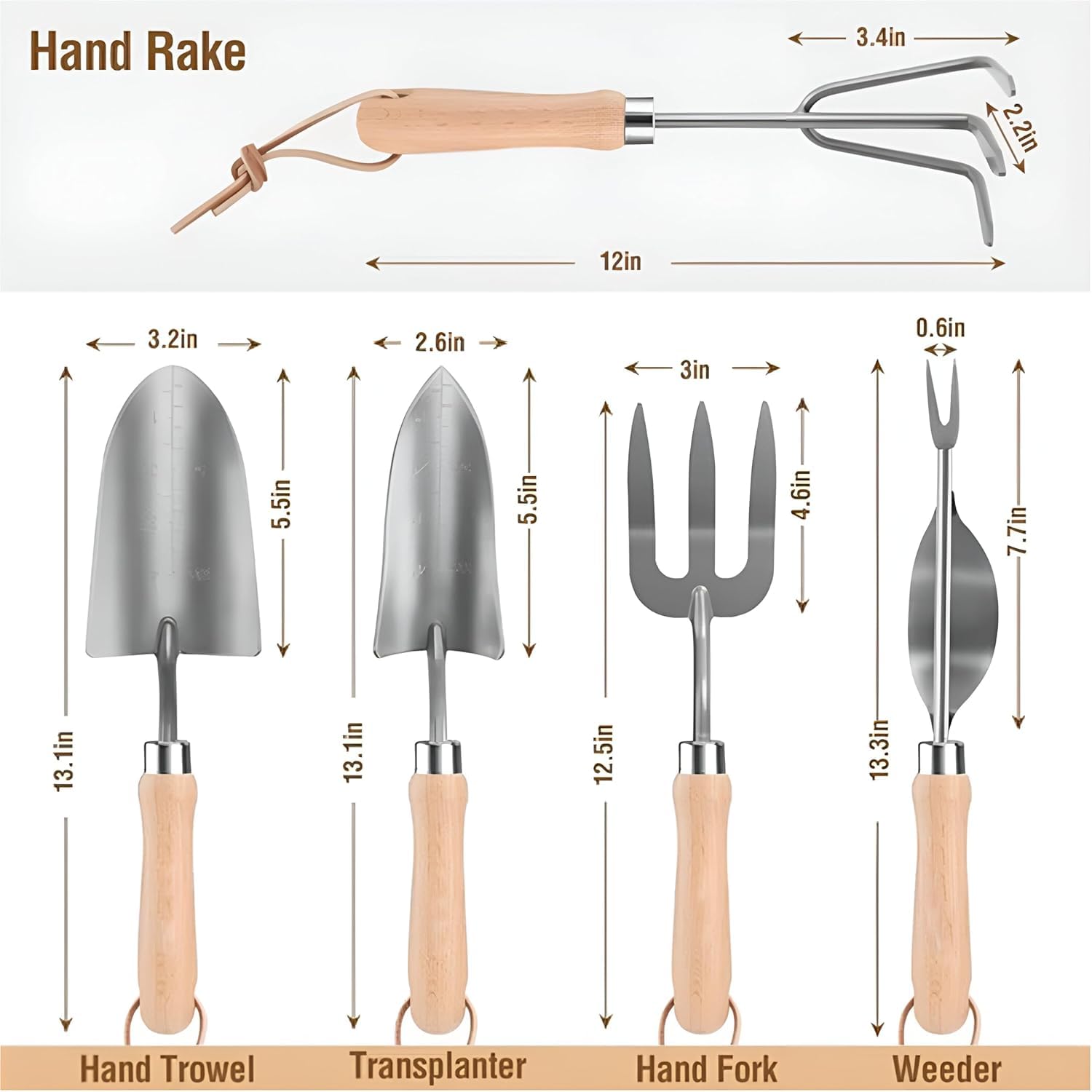 COMPREHENSIVE TOOL SET: This gardening kit includes three useful tools – a hand shovel, a transplanting shovel, and a hand rake – providing a complete set for various gardening tasks, from planting and transplanting to raking and cultivating.