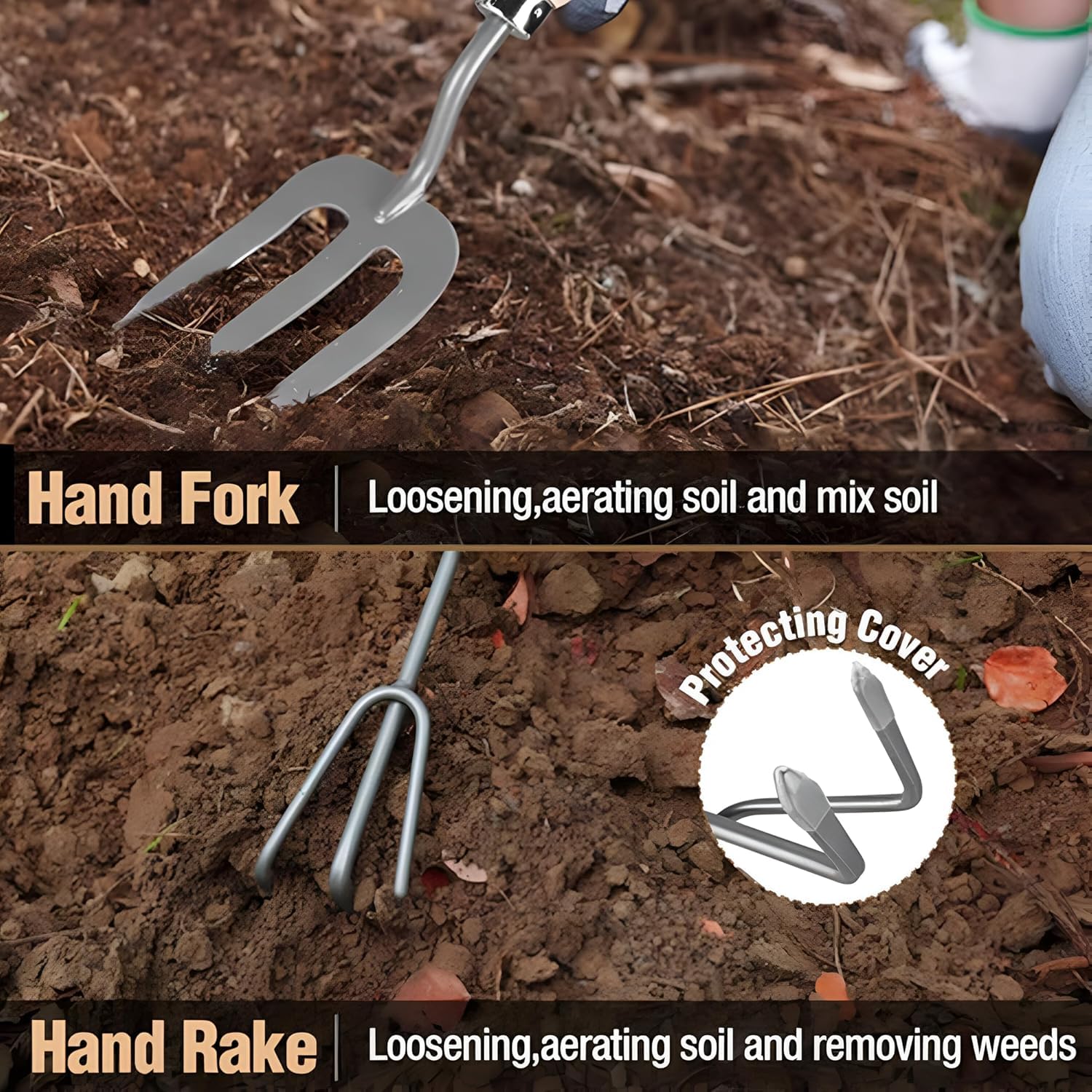 SOFT RUBBER NON-SLIP HANDLES: The garden tools are equipped with soft rubber handles, ensuring a comfortable and non-slip grip during extended use. The ergonomic design enhances control and reduces hand fatigue, making these tools user-friendly for gardeners of all levels.