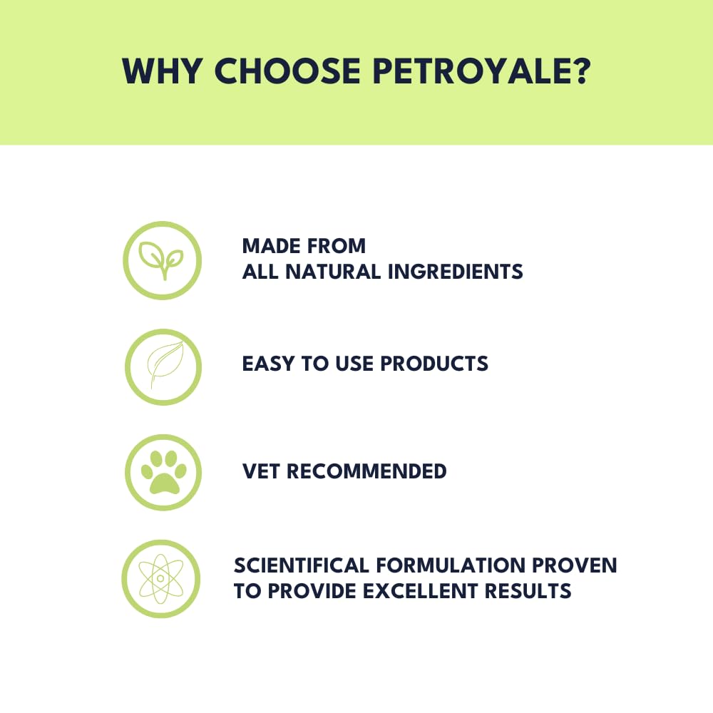 Petroyale Ear Cleanser for Dogs & Cats is a specialized dog ear cleaner solution & Cat ear cleaner designed to ensure optimal ear health. Crafted with powerful ingredients like Salicylic Acid and Organic Aloe, this dog ear cleaner helps remove dirt, excess wax, and mites, which can contribute to ear infections. Regular use of this ear cleaner for dogs & cats prevents the buildup of impurities, keeping your pet’s ears fresh, clean, and healthy.