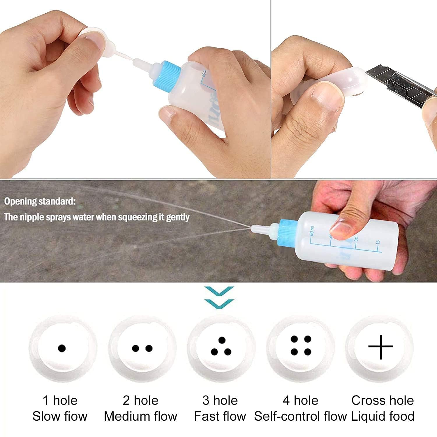 Design Specially designed nipples of different sizes and shapes for different uses. You must open a hole in the rubber nipple before using it, with a needle or scissors to open a small hole to feed it.