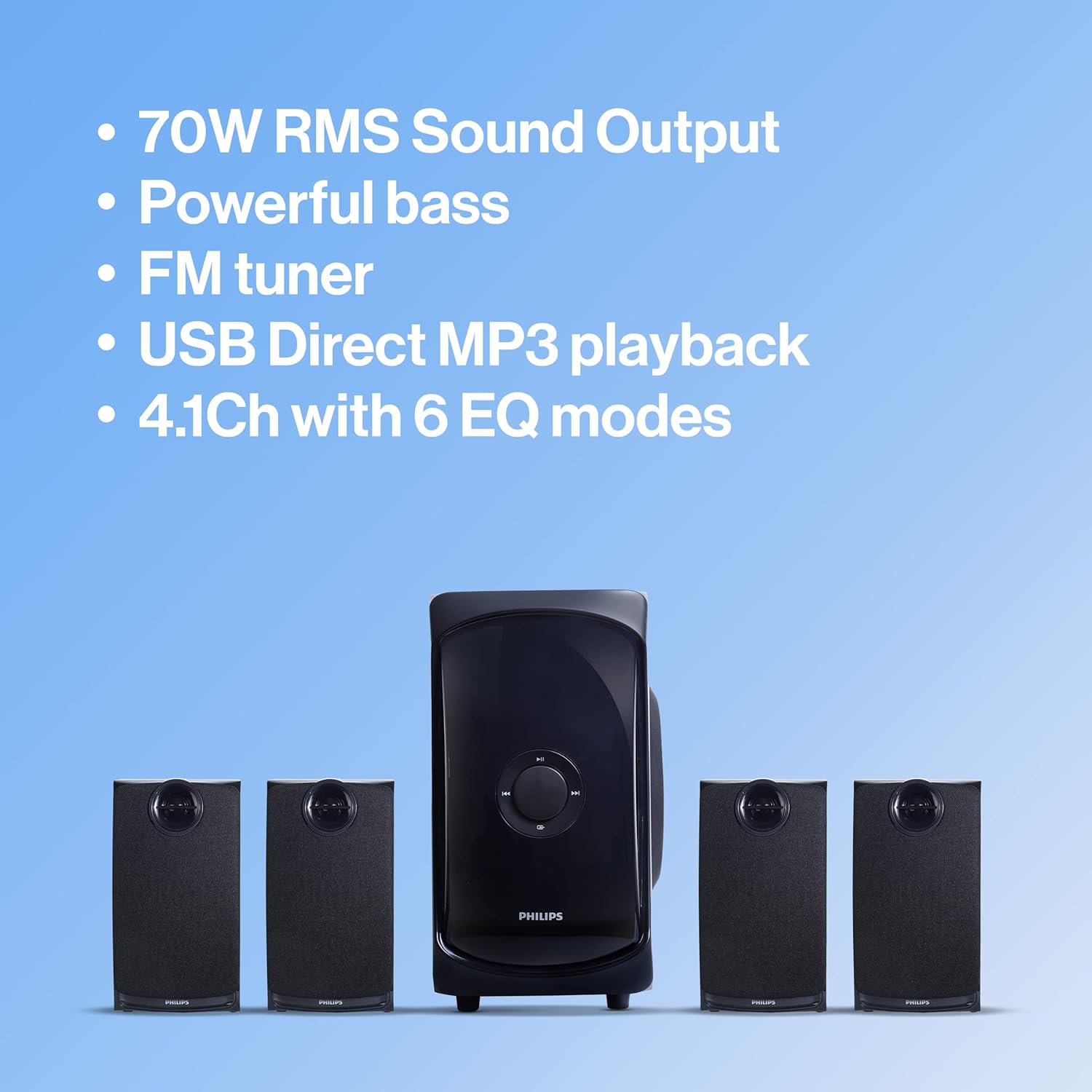 PHILIPS Audio TAV7477 4.1 Channel 75W Bluetooth Multimedia Speaker System with 2x15W & 2x5W Satellite Speakers, Multi-Connectivity Option with Supporting USB, AUX, FM & Remote Control (Black)