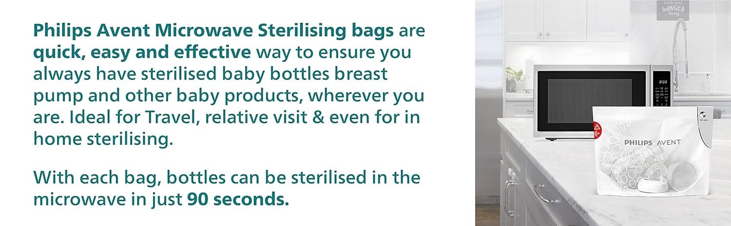 Philips Avent Microwave Sterilizing Bag | Kills 99.9% Germs | Sterilizes Bottles, Breast Pump and Baby Products in 90 Sec | 100 Sterilization Cycle in One Pack | Pack of 5 Bags (White) | Scf297/05