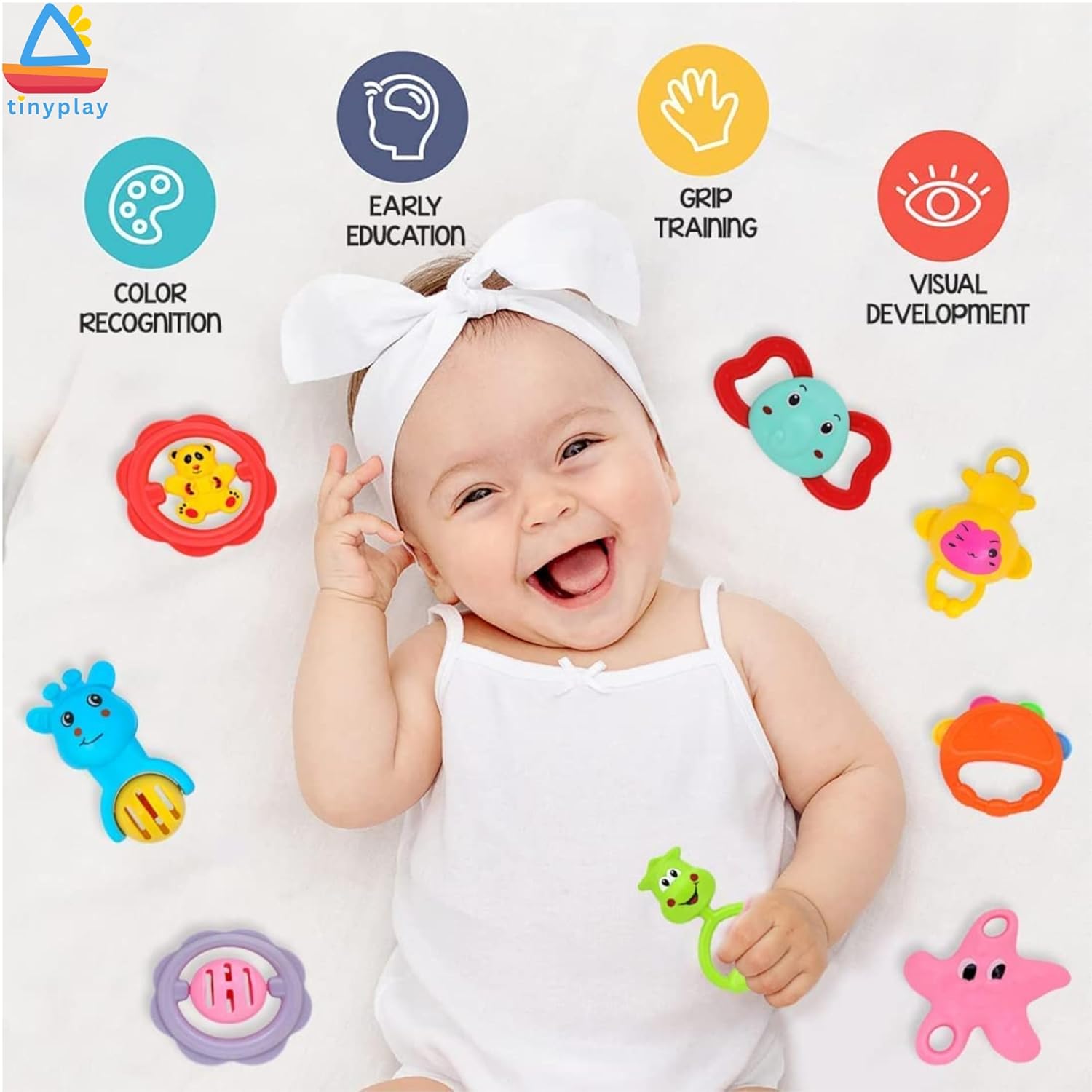 🍼 100% Safe & BPA-Free for Babies 0-6 Months TinyPlay baby rattles for 0 to 6 month are made from non-toxic, BPA-free plastic, ensuring complete safety for newborns and infants. Smooth edges and safe material for teething or mouthing.
