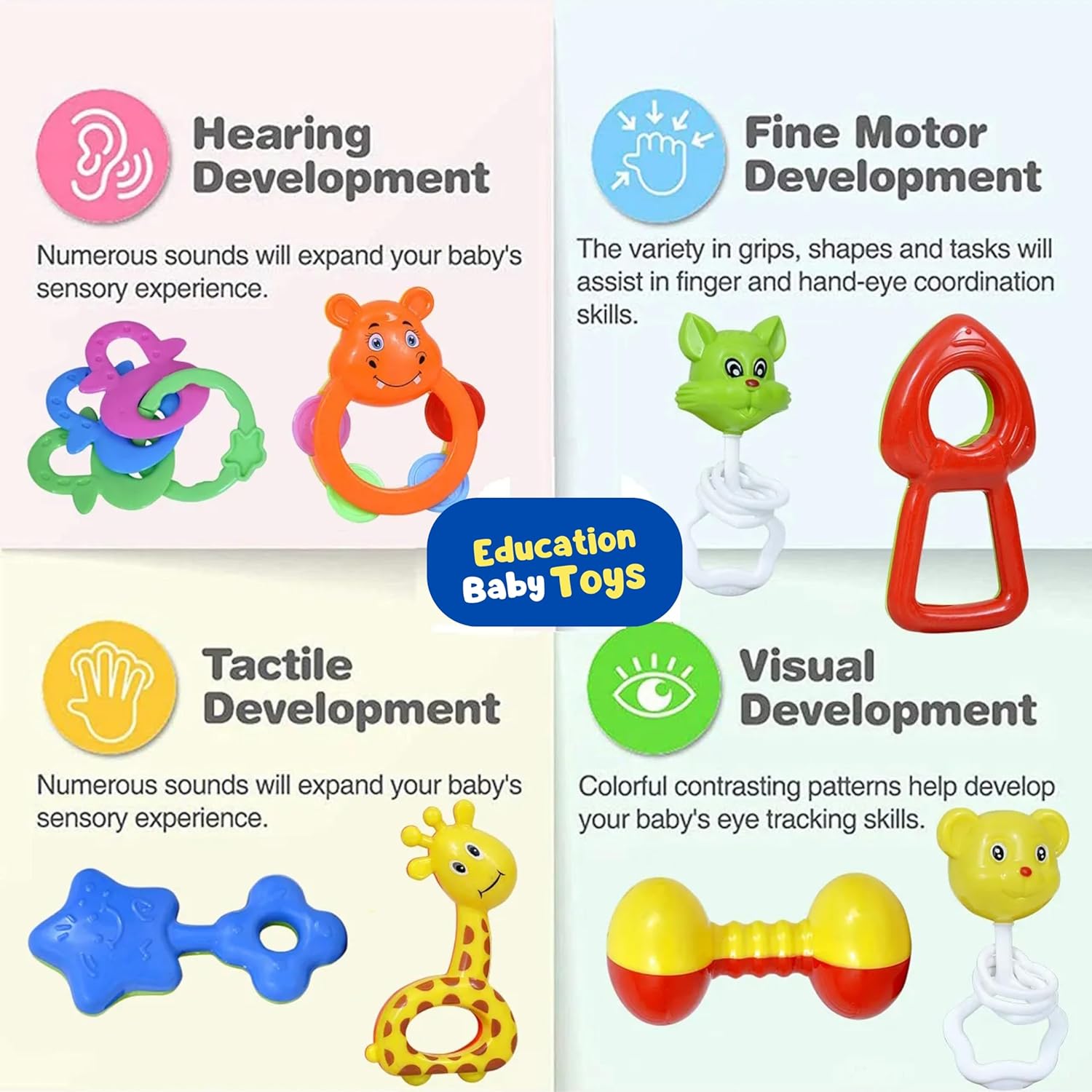 👶 Develops Sensory & Motor Skills This rattle set helps babies improve hand-eye coordination, color recognition, and grip strength. Perfect early development toys for babies 0-6 months and 6-12 months.