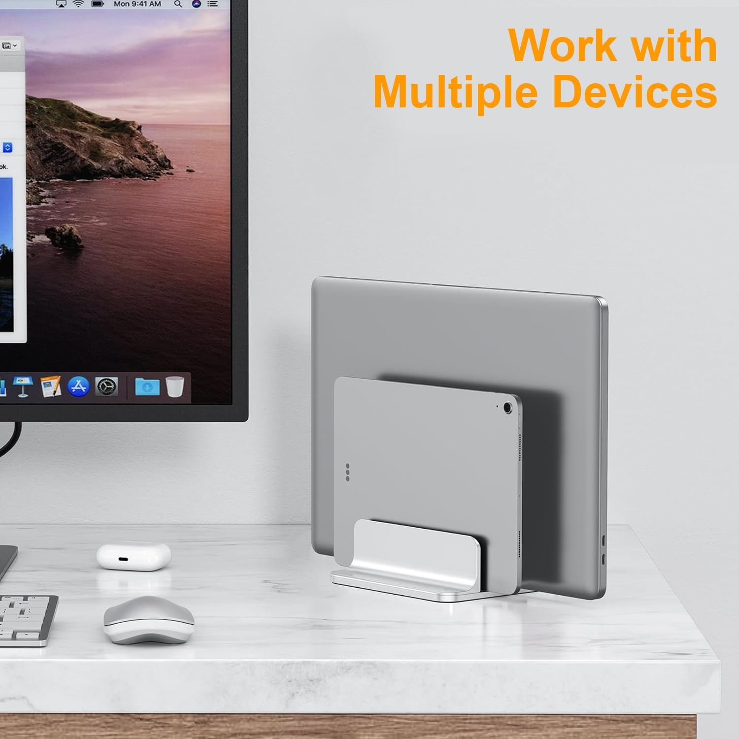Dual-Laptop Support – Designed to hold two laptops simultaneously (MacBook, Surface, Samsung, etc.), featuring adjustable slot width to accommodate various thicknesses.