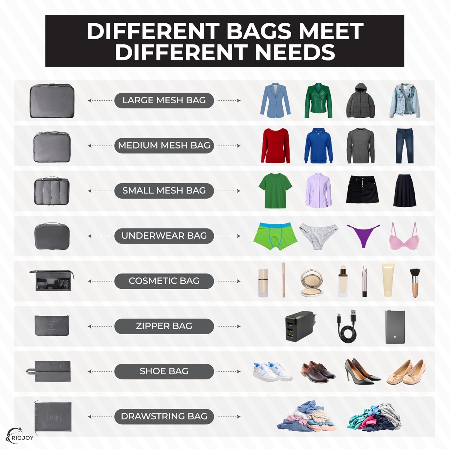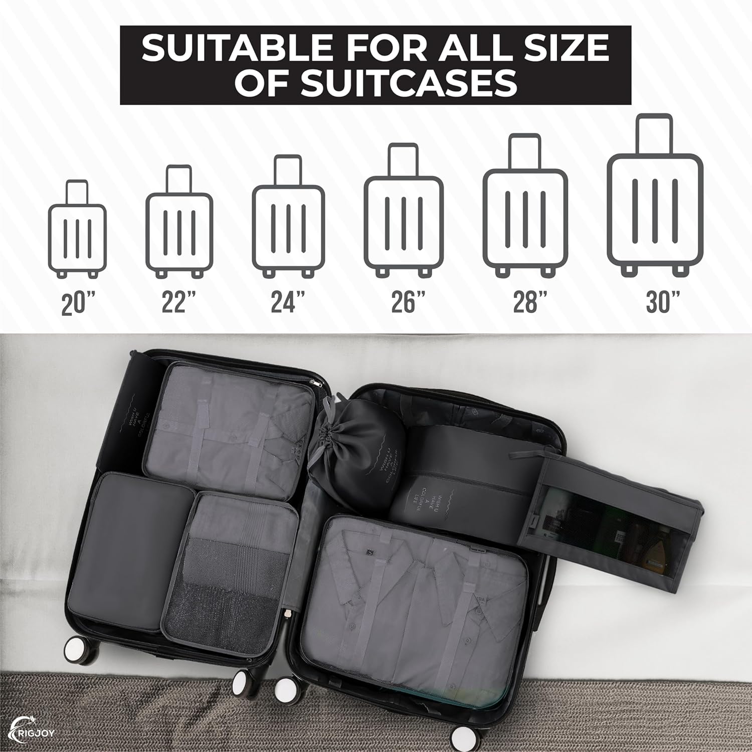 RIGJOY’s 8-piece packing cubes set is designed to streamline and organize your packing process, making travel more convenient and efficient. The set includes a variety of sizes and specialized bags to cater to different packing needs, all in a sleek grey color. Set of 8: Includes multiple sizes of packing cubes, a toiletry/cosmetics pouch, and a shoe bag. Material: Made from high-quality, durable, and lightweight fabric, designed to withstand the rigors of travel. Large Packing Cube: Ideal for bulkier items like jackets, pants, and sweaters. Medium Packing Cubes (2): Perfect for shirts, blouses, and shorts. Small Packing Cubes (2): Suitable for underwear, socks, and accessories. Cosmetics/Toiletry Pouch: Keeps toiletries and cosmetics organized and easily accessible. Protects shoes from dirt and keeps them separate from clothes. Laundry Bag: For separating dirty clothes from clean ones. Benefits: Organization: Keeps clothes and accessories neatly organized and easy to find. Space-Saving: Maximizes luggage space by compressing clothes and reducing clutter. Easy Access: Mesh panels allow for easy identification of contents without unpacking. Versatility: Can be used for various purposes, such as storing electronics, gym clothes, or baby items. High-quality zippers and reinforced stitching ensure long-lasting use. Portability: Lightweight design adds minimal weight to luggage. Usage Tips: Roll clothes before placing them in cubes to save space and minimize wrinkles. Use different cubes for different categories of items (e.g., one cube for tops, another for bottoms). Place heavier items at the bottom of the suitcase and lighter items on top for balanced weight distribution. Accessibility: Keep frequently needed items in the top cubes or the toiletry pouch for Frequent Travelers: Helps maintain order and efficiency during trips. Families: Simplifies packing for multiple family members by keeping items separated. Business Travelers: Ensures that professional attire stays neat and ready for meetings. Vacationers: Streamlines packing for longer trips and multi-destination vacations. The RIGJOY 8 Pcs Packing Cubes set offers a practical, stylish, and efficient solution for organizing your luggage. Its combination of durable materials, versatile sizes, and thoughtful design features make it an essential accessory for any traveler looking to simplify their packing process and enhance their travel experience.
