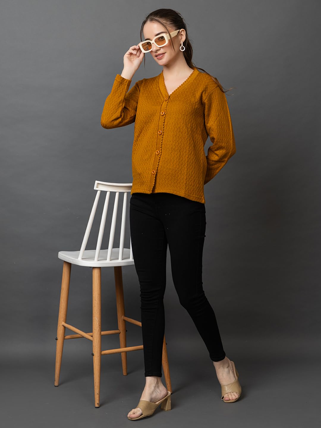 Introducing the Prashar Women’s V-Neck Woolen Cardigan Sweater, a perfect blend of everyday comfort and winter elegance. Designed for girls and ladies who value both warmth and effortless style, this full-sleeve woolen sweater is made with soft, insulating yarn that ensures you stay cozy without compromising on breathability or mobility. The V-neckline and front-button design allow for versatile wear—style it open over a tee or closed for extra warmth. Equipped with side pockets, it combines practicality with sophistication, offering room to carry small essentials or simply keep your hands warm during chilly days. This stylish cardigan sweater is ideal for both indoor and outdoor use—whether you’re at home, commuting to the office, heading to college, or traveling. Its casual yet chic self-design pairs well with denim, trousers, dresses, and leggings, making it a must-have in your winter wardrobe.