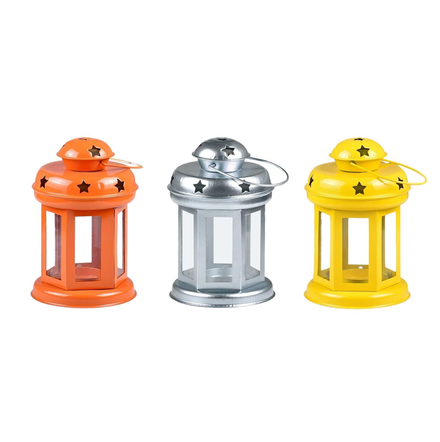 Set of 3 Elegant Lanterns: Includes yellow, gold, and silver tea light holders, designed to brighten up any space with their vibrant colors and timeless charm.