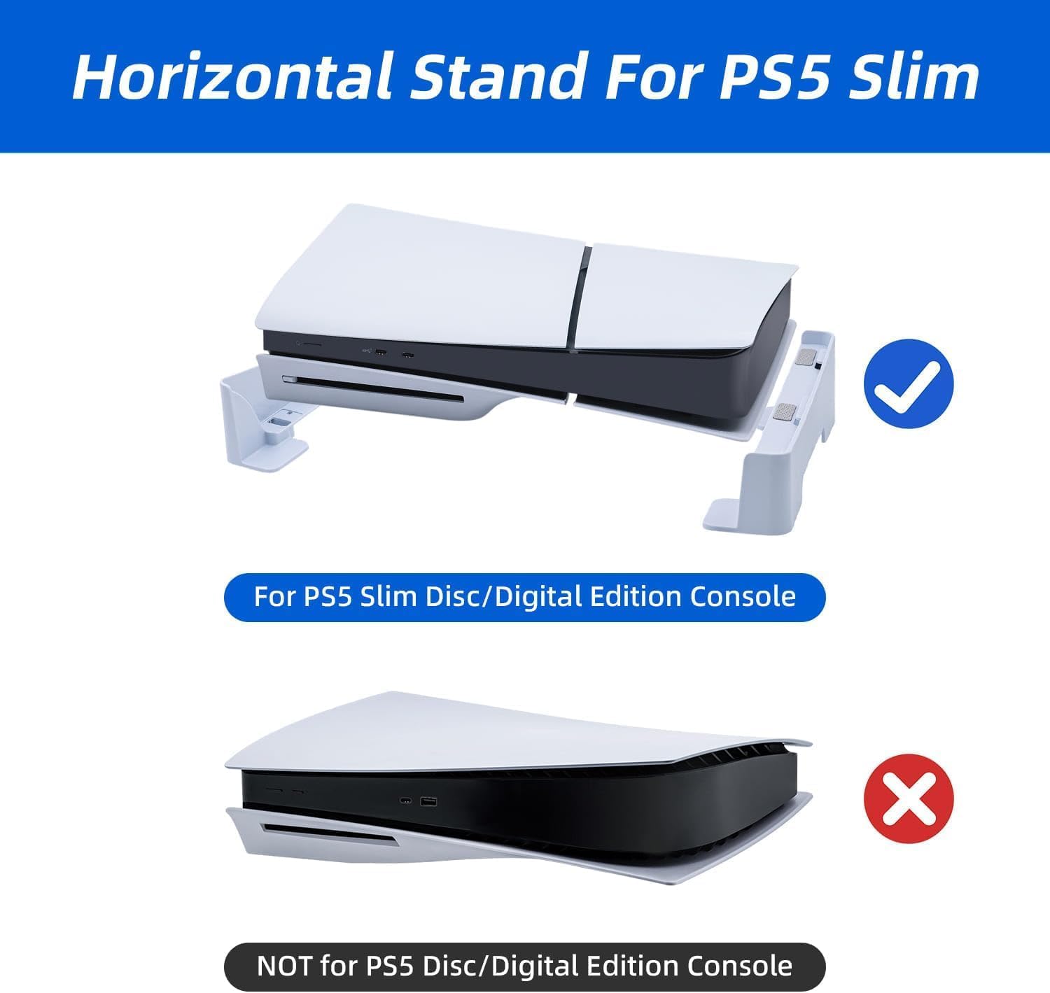 HORIZONTAL ORIENTATION: Upgrade your setup with our contemporary Horizontal Stand created specifically for the PS5 Slim. Its sleek form is engineered for the PS5 Slim Digital & UHD editions, seamlessly blending with your decor. Elevate your gaming experience with our sleek and modern Horizontal Base Stand, compatible with PS5 Slim Digital Edition & Ultra-HD (UHD) Gaming Console. Its minimalist design will complement your gaming setup while saving you space. NOTE: Great for PS5 Slim, NOT for PS5.