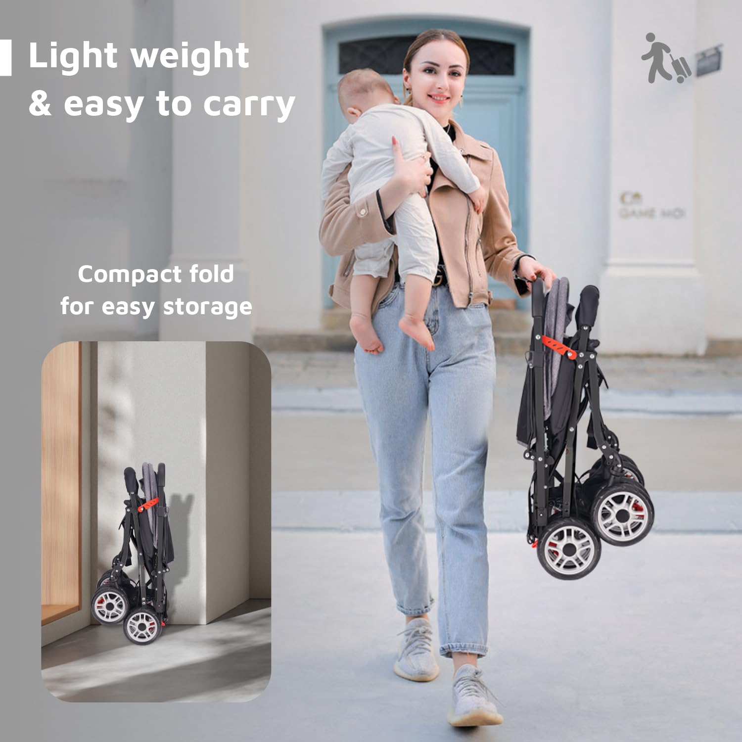 Welcome to the Fold – Push the Bar below with you hand or foot and Pram folds itself. Its so simple that you will say that its Child’s play.