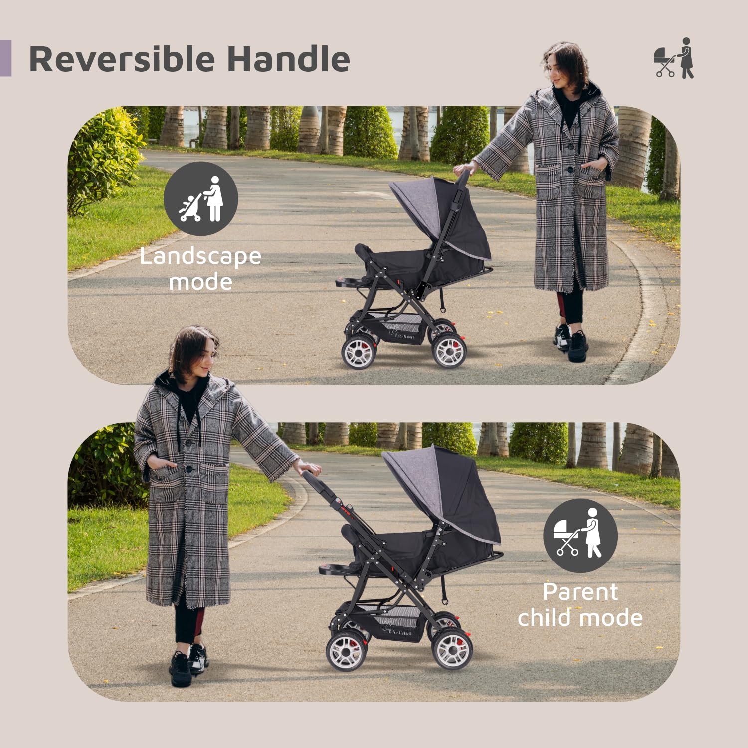 Reversible Handle – Most easy and safe design for Reversible Handle to see your baby’s smile while strolling.