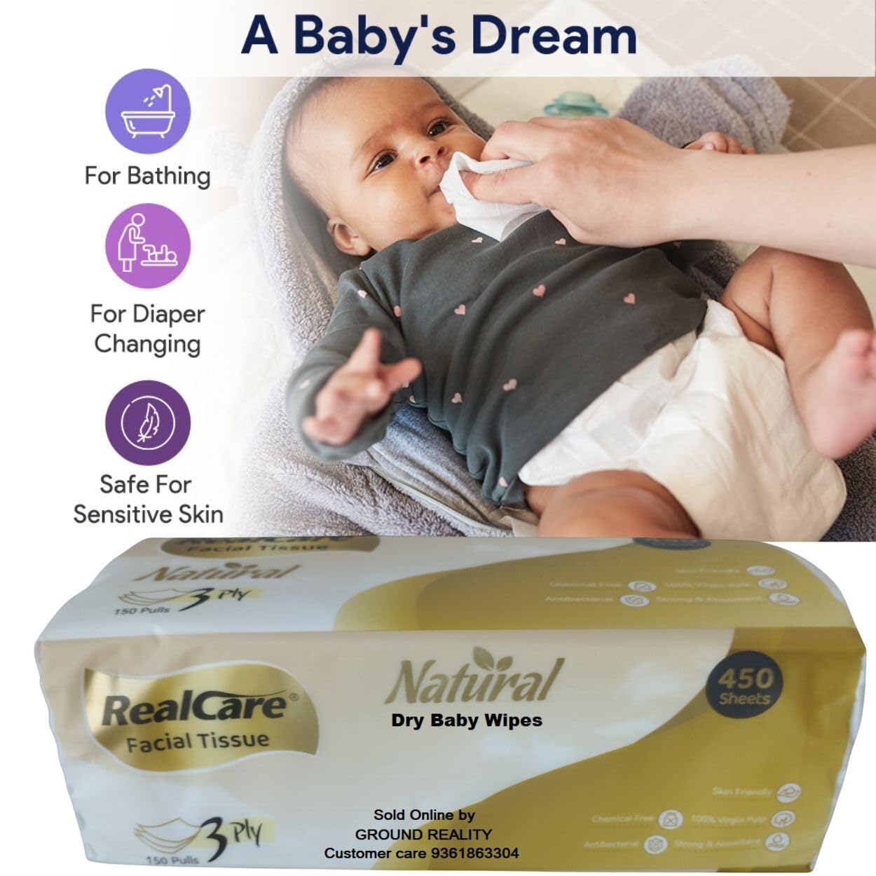 Real Care 3 ply extra thick 150 pulls per pack (450 sheets) dry baby wipes or dry tissue facial wipes are designed for ultimate convenience, hygiene and comfort. Made from 100% Chemical & Alcohol Free Spunlace Fabric, these wipes are soft, smooth and gentle on the skin, making them ideal for sensitive skin of New Born Babies and child. Unmatched Hygiene and safety compared to reusable Face Towels or cloth wipes. Sign in for worry free baby care wipes, be it for Facial cleaning or Potty cleaning, It takes care of all cleaning needs with gentle and mild on skin. Each wipe measures 20x17cms, offering ample coverage for various tasks, including makeup removal, facial cleansing, or wiping away spills.
