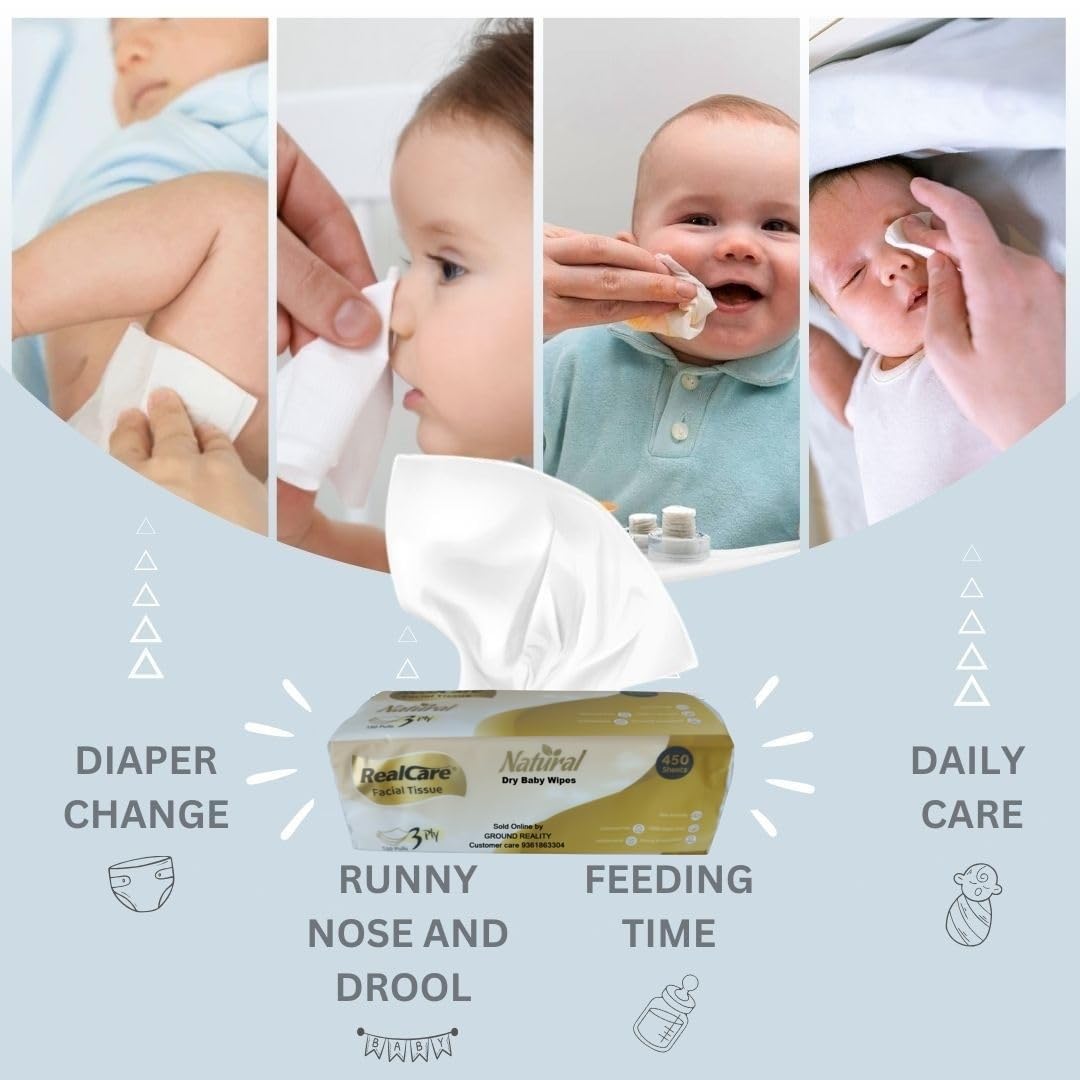 Real Care New Born Baby Dry Wipes, 100% Chemical Free, Hypoallergenic, 3 Ply Extra Thick, Ultra soft Cotton Tissue Wipes for Baby Cleaning, Diapering, Makeup removal (3 Pack | 450 Sheets)