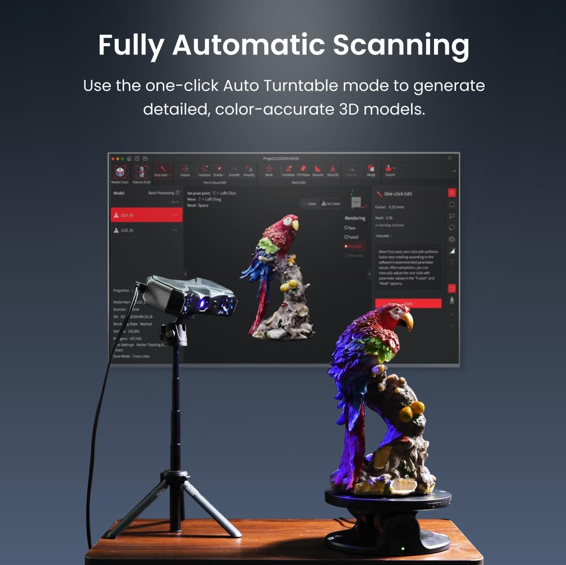 One-Click Scans with Auto Turntable Mode – Equipped with a tripod for stable positioning, MetroX’s Dual-axis Auto Turntable mode entirely automates 3D scanning. It captures metrology-grade point clouds and color, enabling accurate 3D reconstruction. This desktop automation solution is perfect for quick quality inspections, product design, and creating stunning color-accurate models.