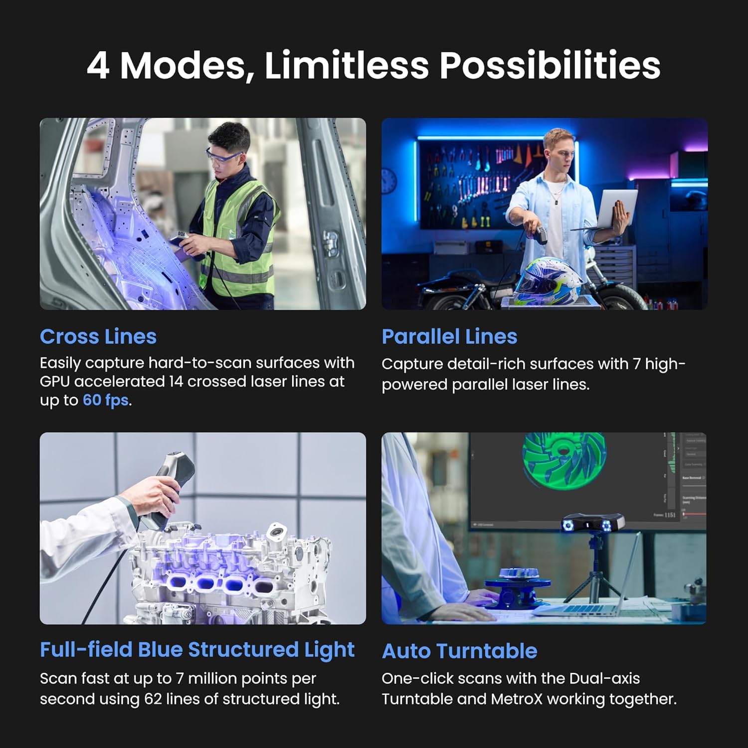 4 Effective Scanning Modes – Effortlessly manage various object types and surfaces with MetroX’s Cross Lines and Parallel Lines modes, which allow for detailed scanning of challenging surfaces. The Full-field mode provides rapid capture rates of up to 7 million points per second, while the Auto Turntable mode enables fully automated, metrology-grade scanning.