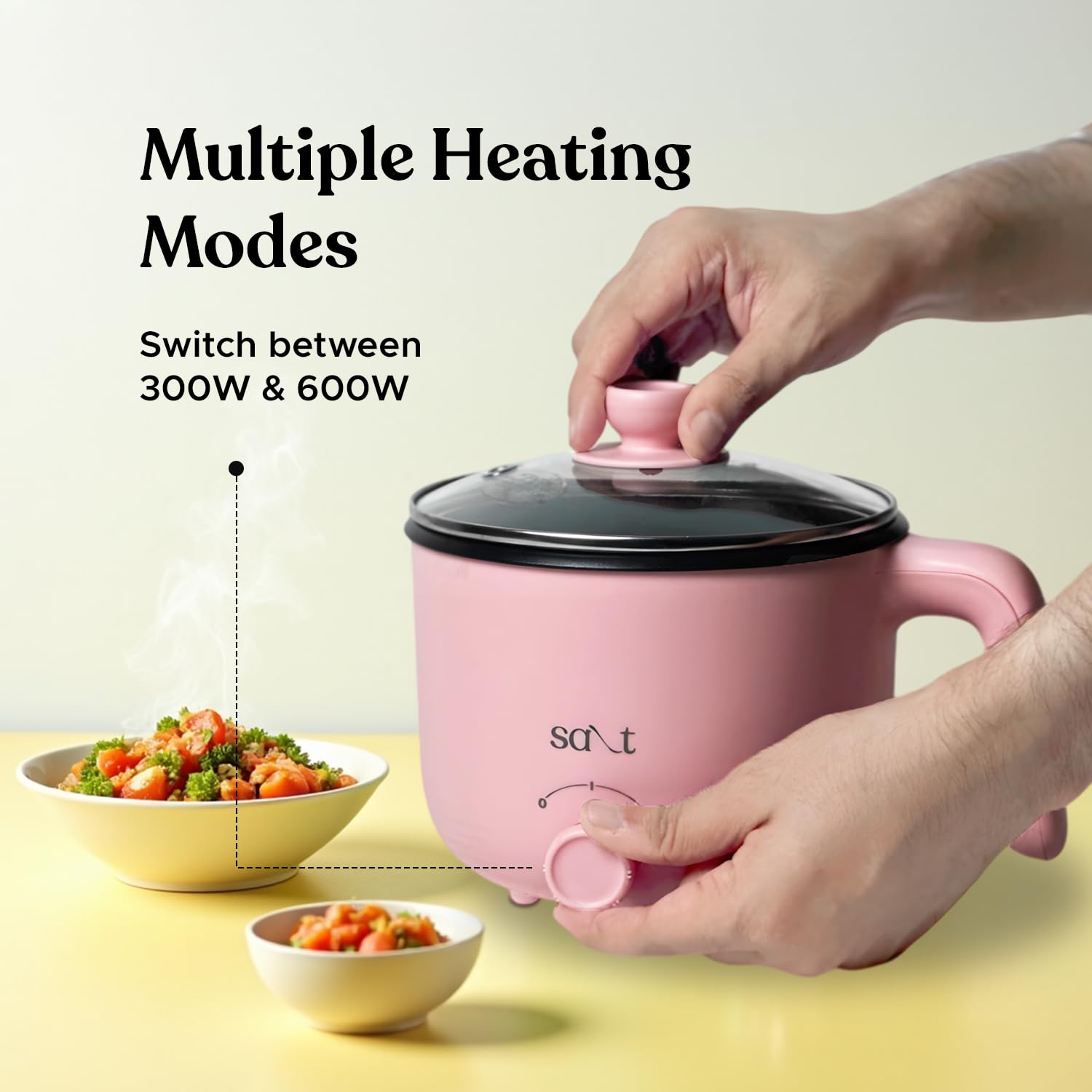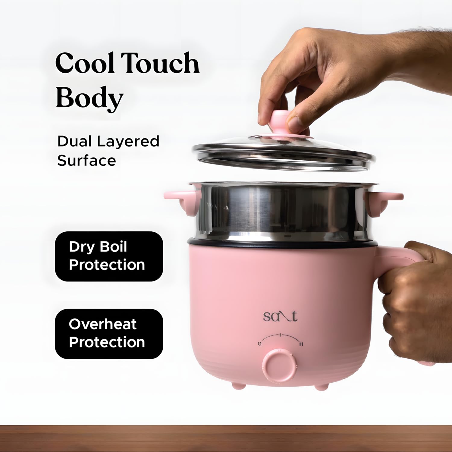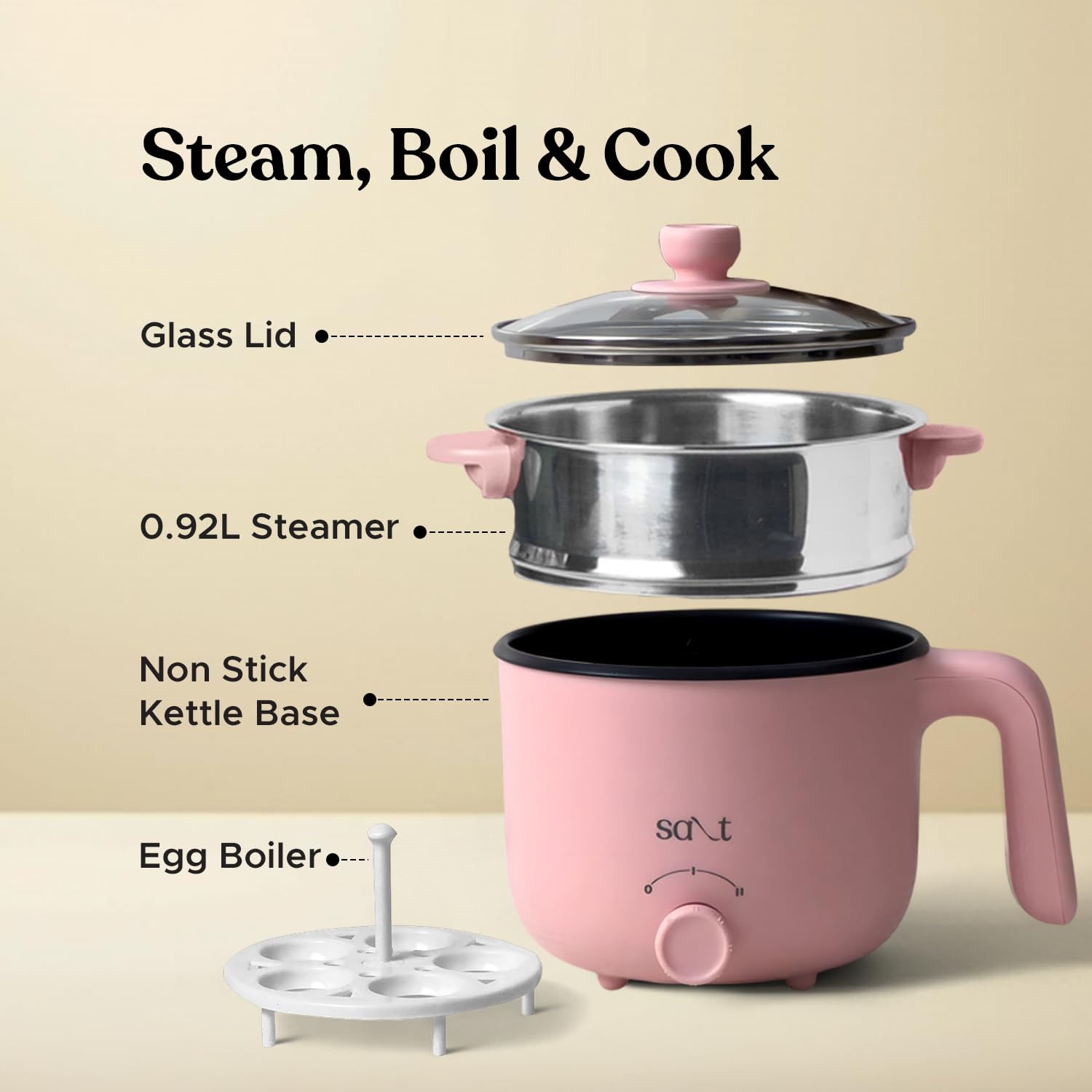 Salt FlexiCook Pro Multi Cook Kettle | 600W Power, Multi Power Mode | Stainless Steel Base with Non Stick Coating | Boil Dry Protection | Steamer & Egg Boiler | 1.2 Liters (Pink)