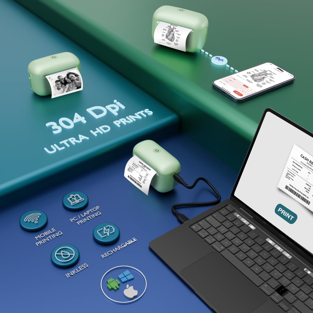 𝐔𝐋𝐓𝐑𝐀 𝐇𝐃 𝐏𝐑𝐈𝐍𝐓, 𝐂𝐎𝐌𝐏𝐀𝐂𝐓, 𝐋𝐈𝐆𝐇𝐓𝐖𝐄𝐈𝐆𝐇𝐓 & 𝐙𝐄𝐑𝐎 𝐌𝐀𝐈𝐍𝐓𝐄𝐍𝐀𝐍𝐂𝐄: Dimensions – 9 x 6 x 4 cm. Weight- 190gm, Zero maintenance Ink-less printing, No Cartridge, No Ink required, smart thermal technology to print. Just use cheap eco-friendly thermal paper. It is cost effective, new age technology.