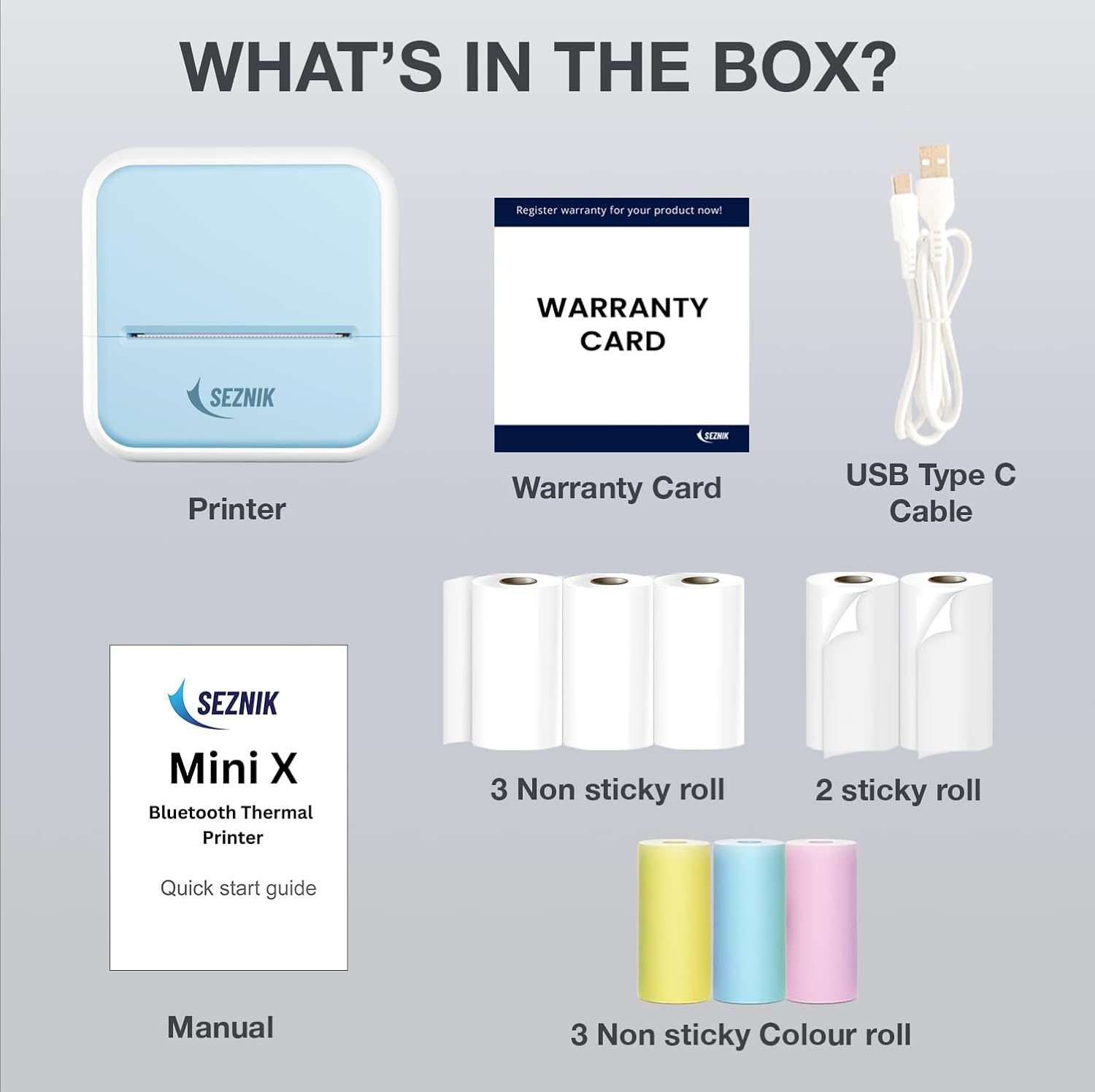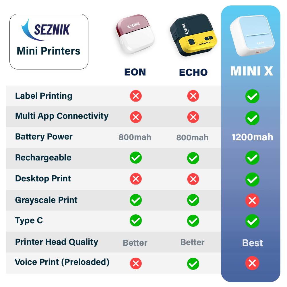 SEZNIK Mini Wireless Monochrome Home Inkjet Printers, Inkless, Bluetooth, Portable Pocket Printer, Compatible with Android, iOS Mobile. 1 Year Warranty (Minix-Blue)