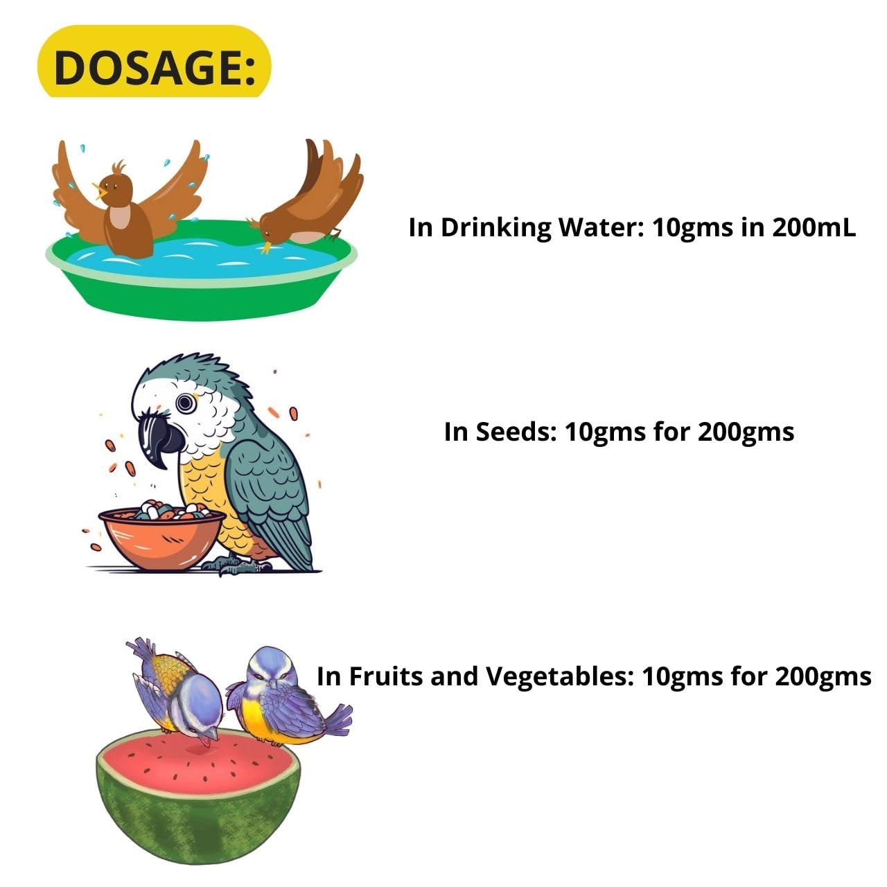 DIRECTIONS TO USE: Add birds healer in the drinking water or mix with the Regulars diets. The infected birds may not consume water & feed in such case make sure the birds accept the medicine, if not apply directly in their beak.